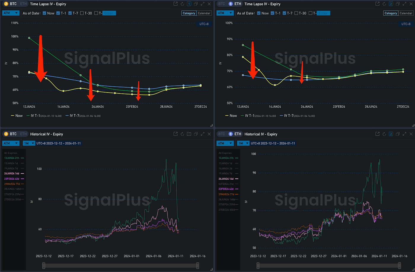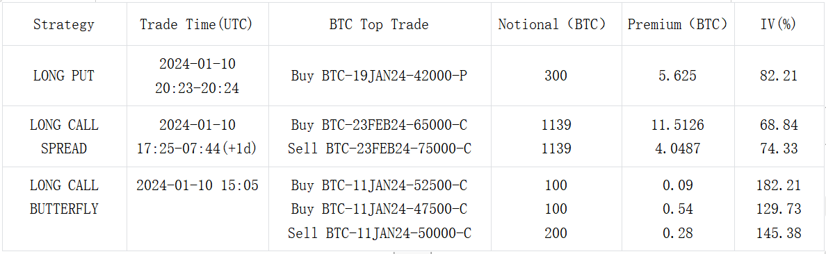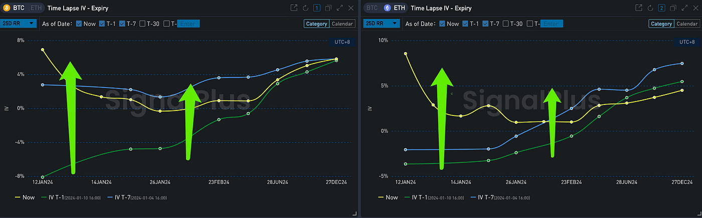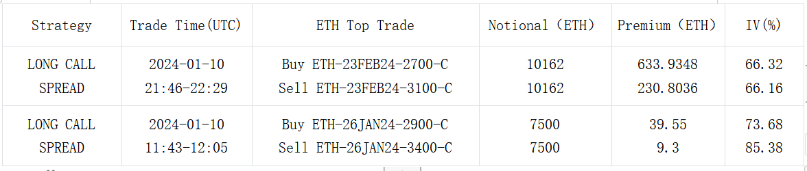 In the options market, following the confirmation of the ETF event, the overall Implied Volatility of BTC significantly dropped to around 60% due to a relatively calm spot market reaction. The extent of the curve inversion weakened. In contrast, the market seemingly mapped out a larger blueprint for ETH’s future upward potential, assigning it higher uncertainty. The middle-to-back end IV of ETH fell less, with its various maturities’ IV levels being 6 to 8% Vol higher than BTC. In terms of trading, the bullish strategy of buying calls still dominated the bulk market. The volume of ETH trades saw a significant boost. A large number of Long Call Spread orders, exemplified by the 23 FEB 24 2700 vs 3100, flooded the market, leading to a noticeable upward movement in the Vol Skew across various maturities.