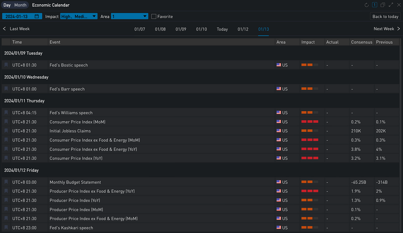 Yesterday (January 10), traders were cautious ahead of the release of CPI and initial jobless claims data. U.S. Treasury yields saw a slight uptick during the day but eventually gave back all gains, with the current two-year/ten-year yields at 4.341% / 3.993% respectively. All three major U.S. stock indices ended higher, with the Dow Jones, S&P, and Nasdaq rising 0.45%, 0.57%, and 0.75%, respectively. New York Fed President Williams mentioned in his speech that the current rate is restrictive enough to achieve the 2% target, and the Fed could consider rate cuts when there is confidence in meeting the 2% inflation target. The speed of the rate cuts will depend on the economic situation. He also noted that it’s not yet time to slow down the balance sheet reduction, aiming for a gradual realization in 2024.