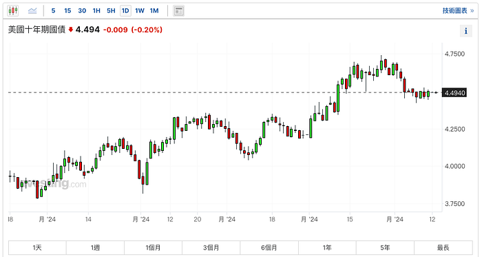 Last Friday, macroeconomic data in the United States performed poorly. The one-year inflation rate expectation for May rose from 3.2% to 3.5%. The University of Michigan Consumer Confidence Index showed weakness, dropping to 67.4. This offset the positive impact of recent soft employment data on market risk sentiment. The yield on the ten-year US Treasury briefly rose above the 4.5% mark, while the two-year yield, which is more sensitive to interest rate policies, climbed to 4.853%. Risk assets showed relative stability, with the three major US stock indices showing mixed performance. The Dow and S&P both closed slightly up by 0.32% and 0.16% respectively, while the Nasdaq fell by 0.03%. The focus of the market this week will be on the CPI data released on Wednesday, which could become a key driver of mid-term price trends.