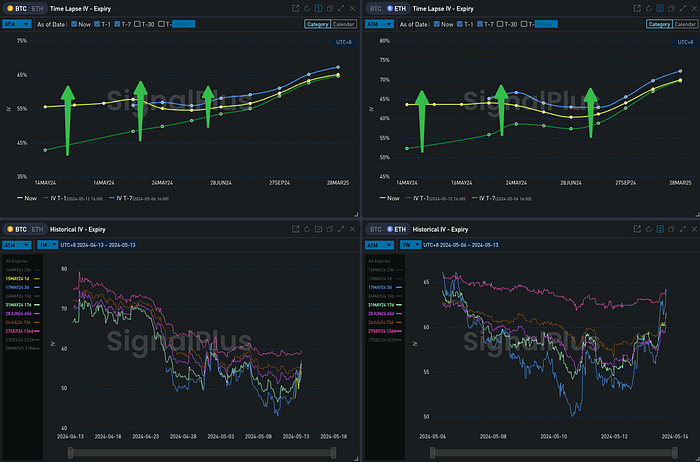 In terms of cryptocurrency, at the beginning of the week, BTC started strongly, with short-term breakthroughs reaching above the 63,000 mark. Implied volatility at the front end showed a significant increase, especially on May 17, influenced by CPI uncertainty, forming a local IV peak. Investors are closely watching for signs of cooling in consumer prices, which could drive market speculation in digital currencies and other risky assets. However, on the other hand, a poor inflation report could also trigger concerns among traders about economic overheating, potentially leading to a decline in cryptocurrency prices.