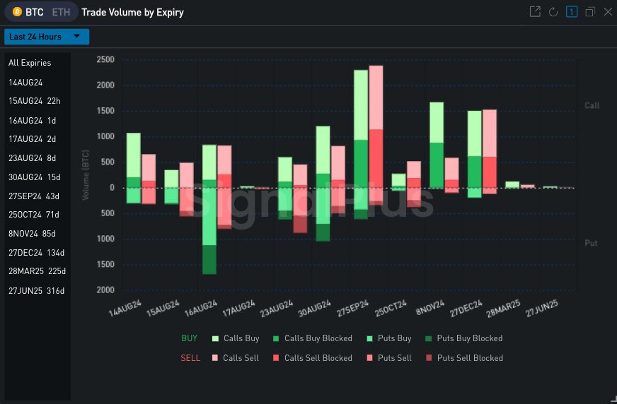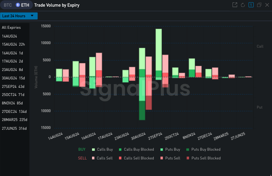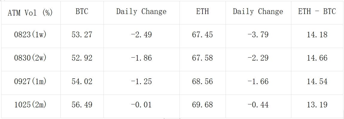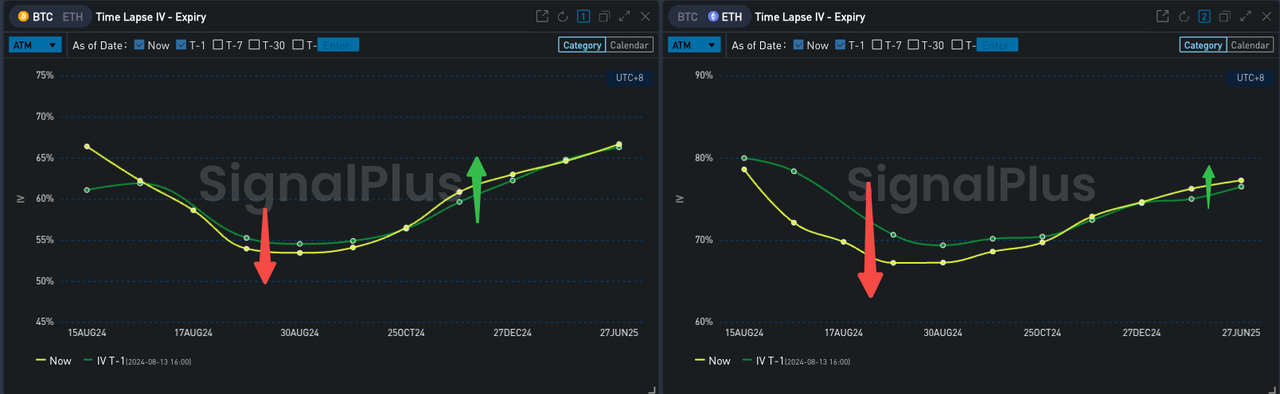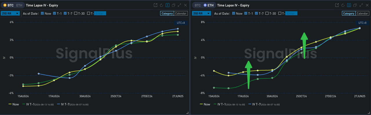 As cryptocurrency prices climbed, the volatility curve steepened again. Specifically, the release of the PPI data dispelled some uncertainties, causing a notable drop in the implied volatility (IV) at the front end (especially for ETH), though the IV at the back end slightly increased due to the high volatility premium associated with tonight’s CPI data, continuing to see some buying on the top side in trades. From the perspective of volatility skew, ETH’s risk reversal (RR) continued to rise. Notably, on August 12, Grayscale’s ETHE fund saw an end to capital outflows for the first time, marking a significant turning point. Overall, ETFs experienced positive inflows for two consecutive days, providing support and confidence for ETH prices, pushing them past the $2,600 and $2,700 resistance levels and challenging the $3,000 mark once again.