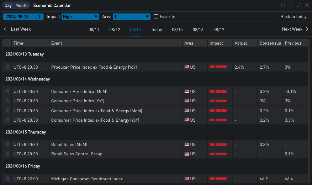 On August 13, the U.S. Producer Price Index (PPI) for July rose by 2.2% year-over-year, which was below expectations and marked a significant decline from previous values. Ahead of today’s CPI release, traders increased their bets on the Federal Reserve easing its policies. The yield on the 10-year Treasury note reported a recent low of 3.838%, and the 2-year yield dropped below 4%, reporting at 3.941%. U.S. stocks were collectively boosted by this news (Dow Jones +1.04%, S&P 500 +1.68%, Nasdaq +2.43%), helping Bitcoin to break above $60,000 (closing at $60,874, up 2.75%) and Ethereum to surpass $2,700 (closing at $2,725, up 2.75%).