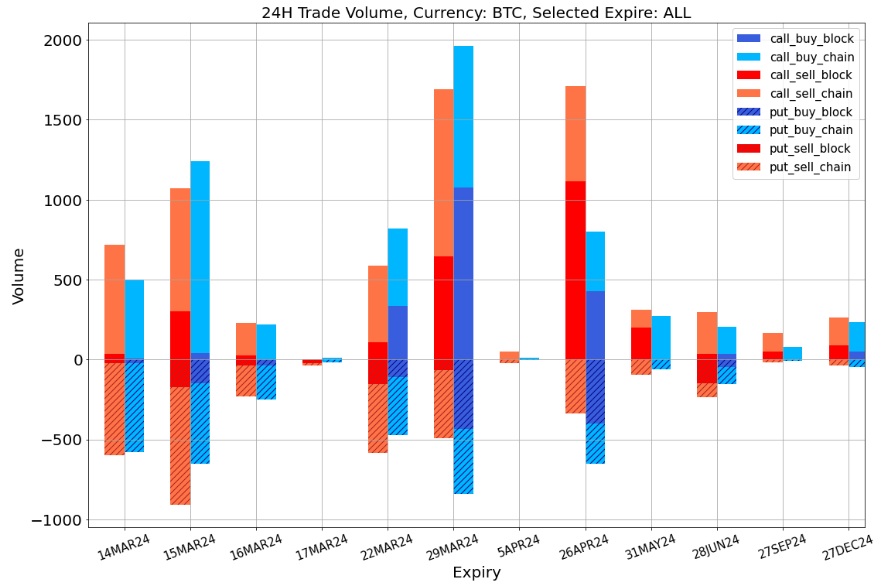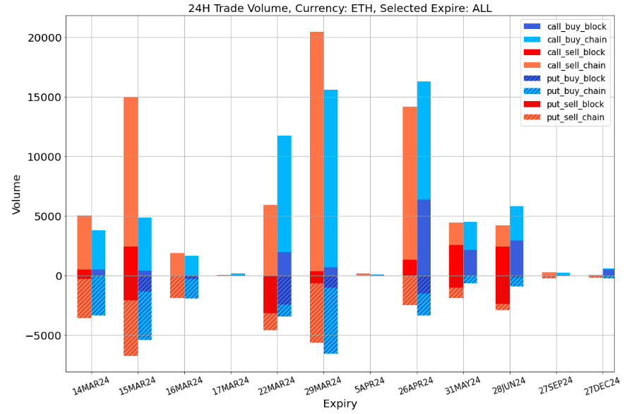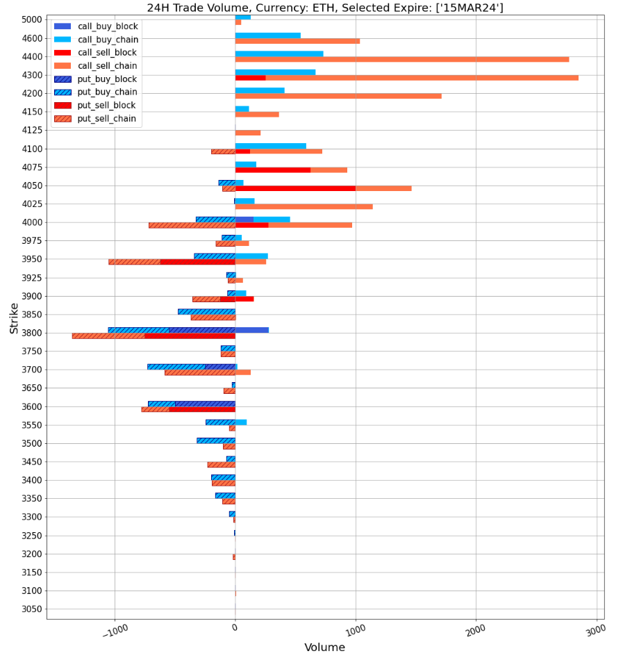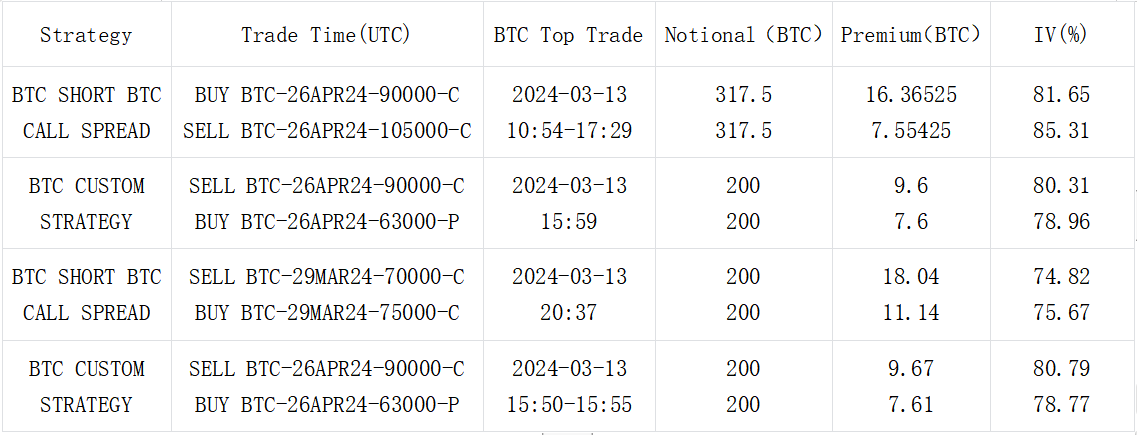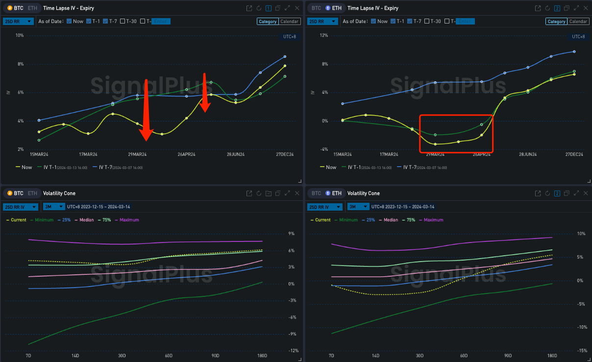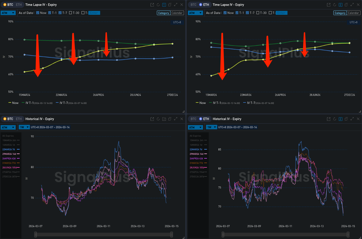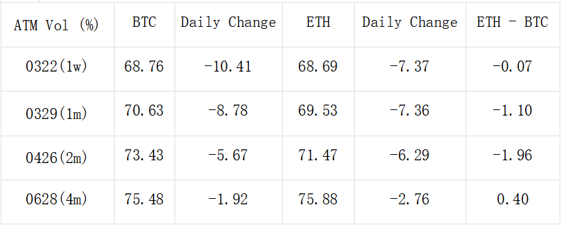 In terms of digital currencies, BTC and ETH have experienced minor fluctuations at their peaks, with actual volatility showing a trend of contraction. Implied volatility has steeply declined, bringing the overall level back to around 70%. The BTC & ETH Put for 15 MAR and ETH Call have both faced significant selling pressure. On the other hand, selling the BTC Sell 29 MAR/26 APR Call Spread has become a popular strategy in bulk trading, and during this period, the BTC Vol Skew has notably decreased, forming a local low similar to ETH in terms of duration.