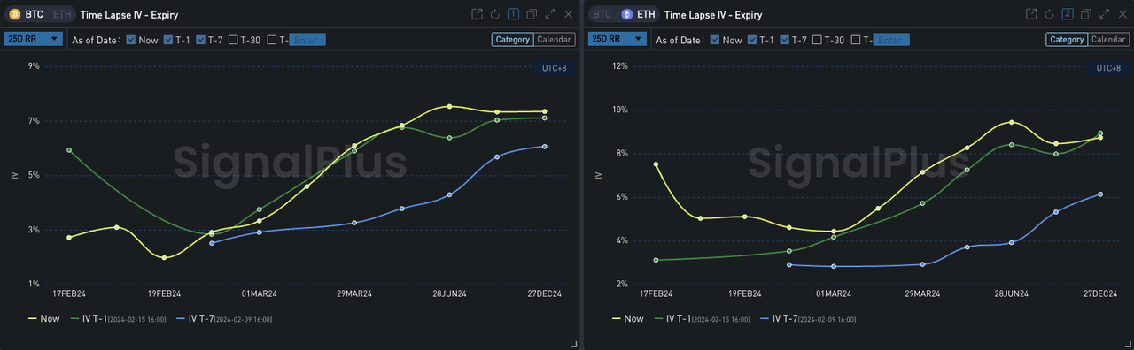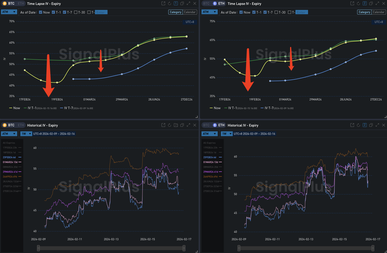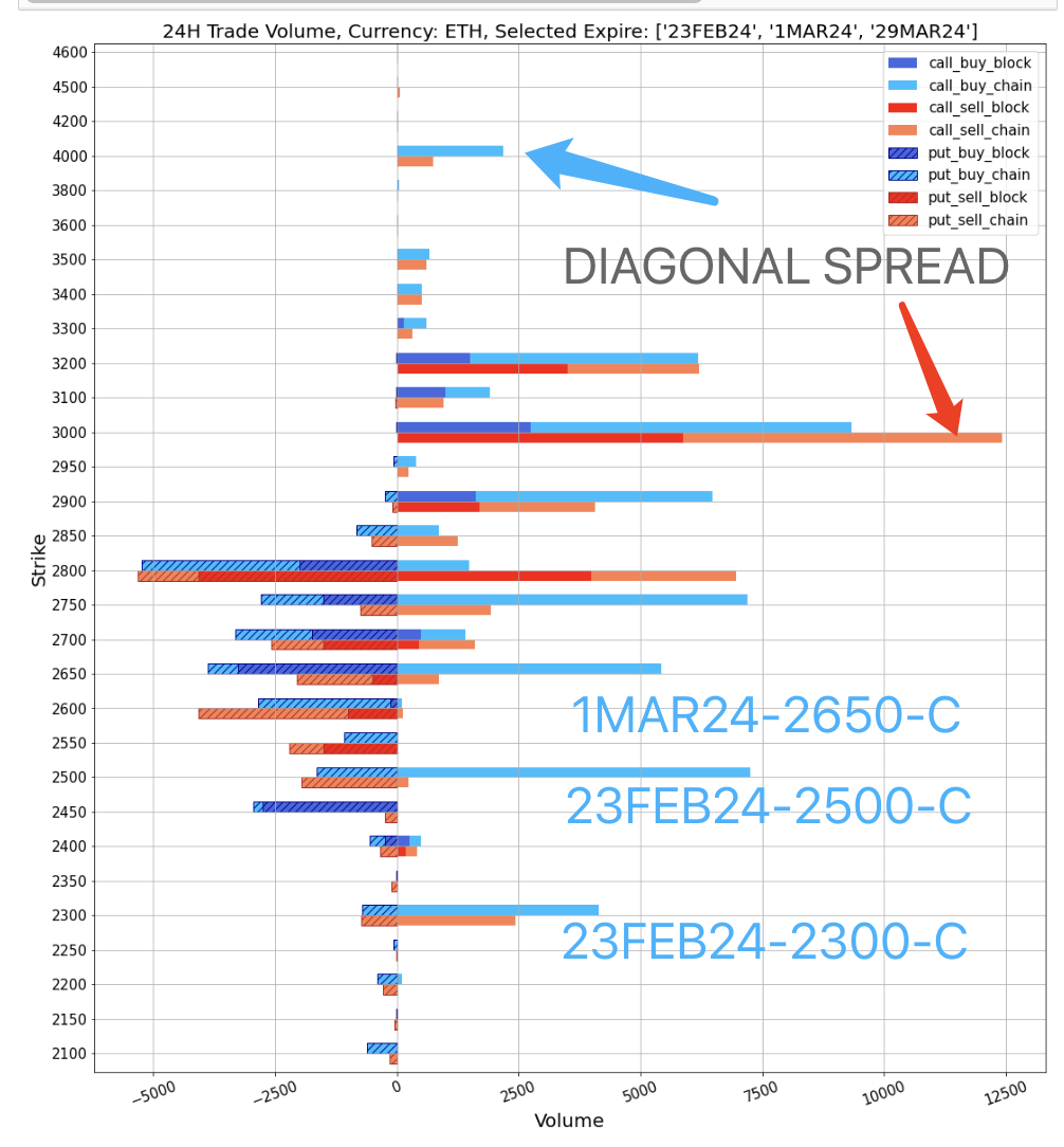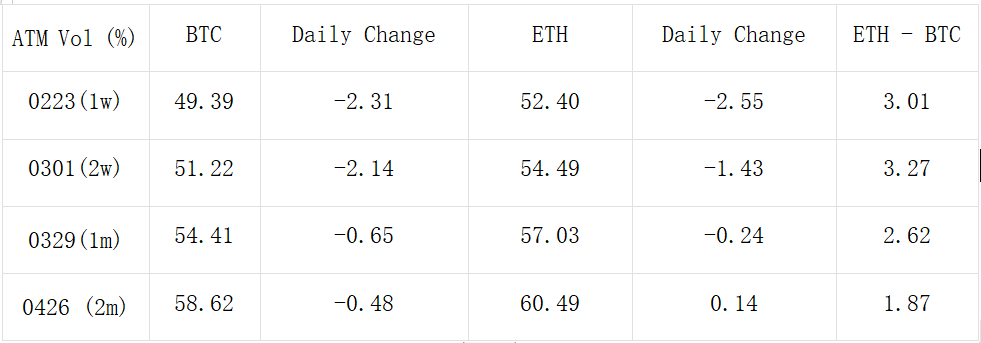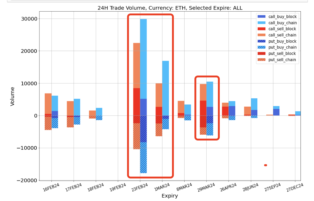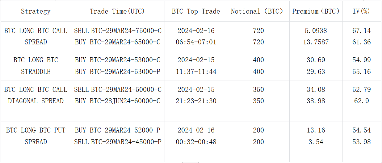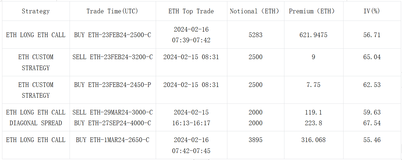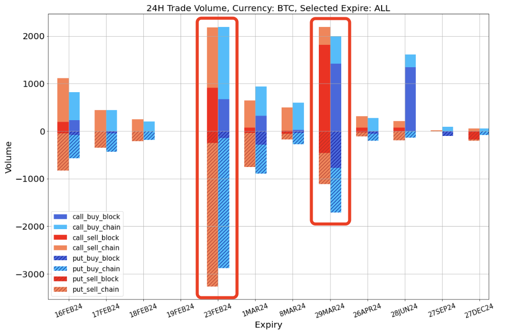 In the realm of digital currencies, the bullish sentiment towards BTC quickly weakened as it approached the $52,000 mark, with the price maintaining slight fluctuations (-0.08%) over the past 24 hours. This caused the implied volatility curve for options, including ETH, to steepen, with front-end declines of about 1.5–2.5% Vol. From the trading distribution, one can observe the play of a 23FEB 52000 vs 48000 Put Spread, where selling pressure slightly outweighs, while on the longer end, there still exists large bullish strategy positions represented by a 29MAR24 65000 vs 75000 Call Spread (720BTC per leg). On the other hand, ETH’s upward momentum continues, closing up at 2819.22 (+1.53%) for the day. Around 23FEB 2300/2500 and 1MAR 2650, there were numerous closeout orders for in-the-money call options to stop losses.