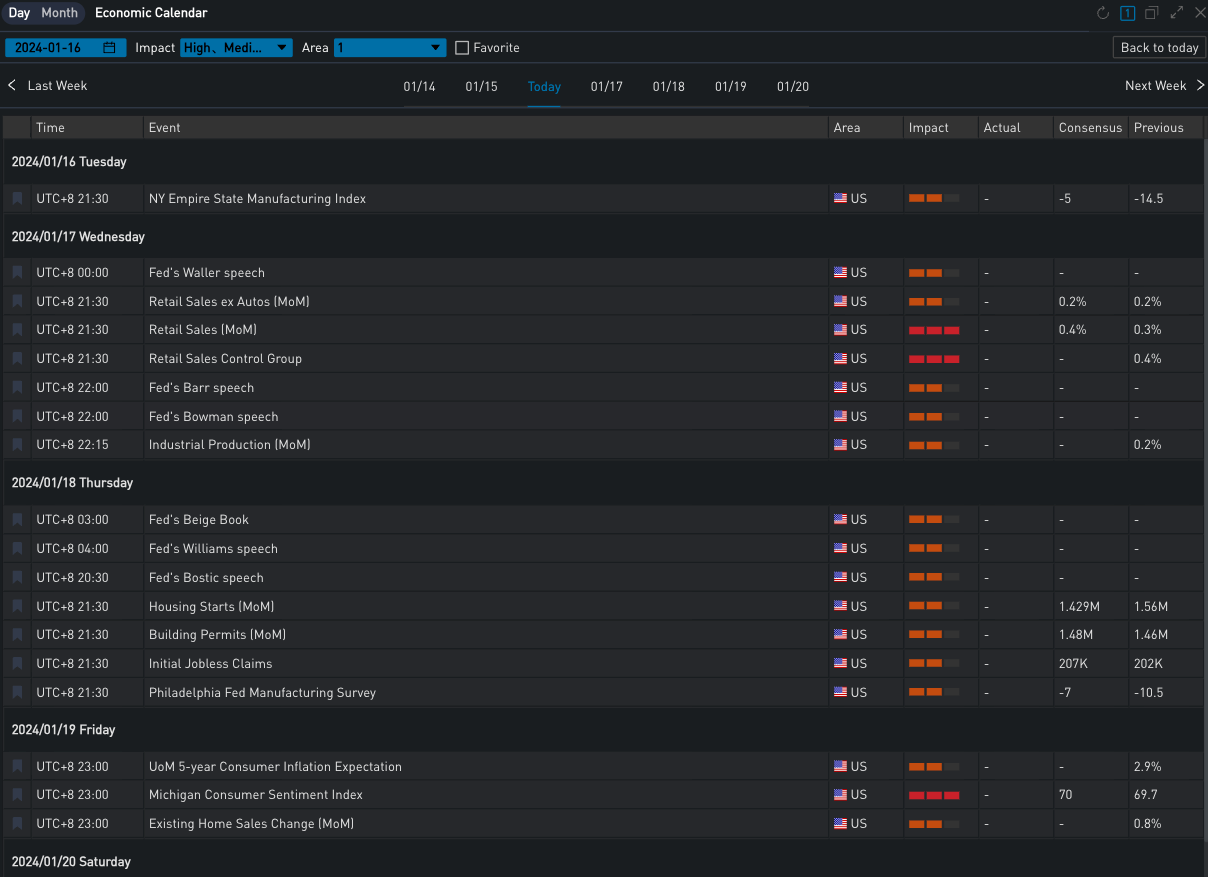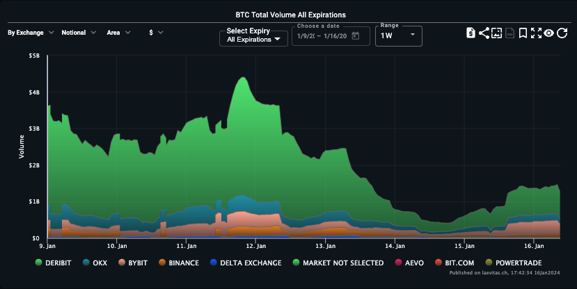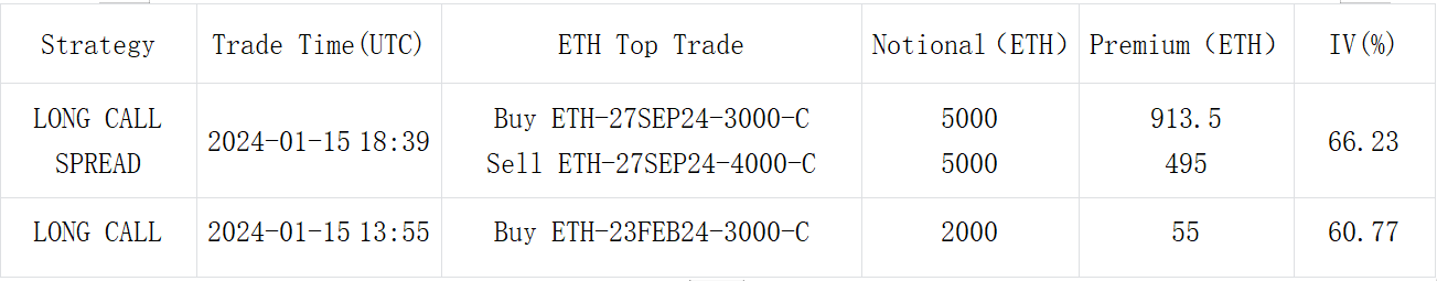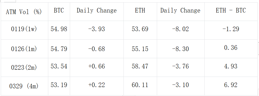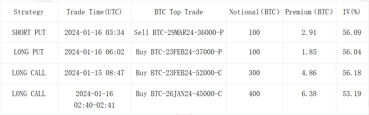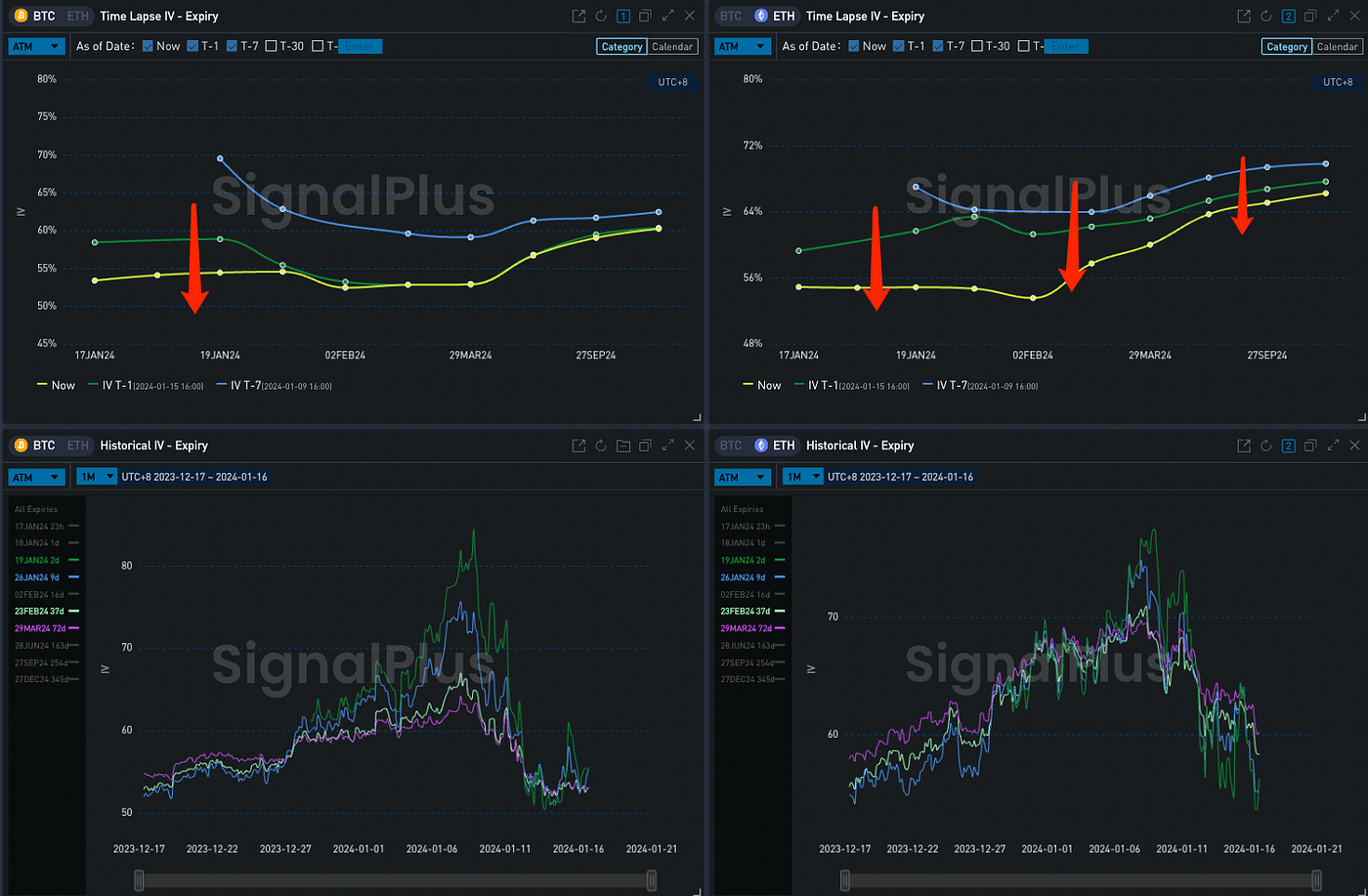 Yesterday (January 15th), influenced by the Martin Luther King Jr. Day holiday, US stocks and bonds were not traded, leading to a generally calm market. In terms of digital currencies, BTC continued to fluctuate slightly within the 42,000 to 43,000 range, with a slight increase of 0.22% during the day. ETH, on the other hand, stayed above 2,500, closing with a 0.72% rise. Regarding options, as the actual volatility continued to hover at low points, the front end of the BTC IV curve was adjusted downwards, with the Weekly ATM decreasing by about 4% to 54.98%. The changes in ETH were more significant, with the front and back ends being adjusted down by approximately 8%/3% respectively. Since the approval of the ETF, ETH’s high Vol Premium relative to BTC has significantly converged today, with the IV before February 2, 2024, almost leveling off.