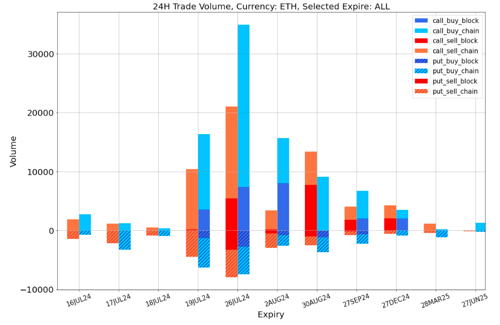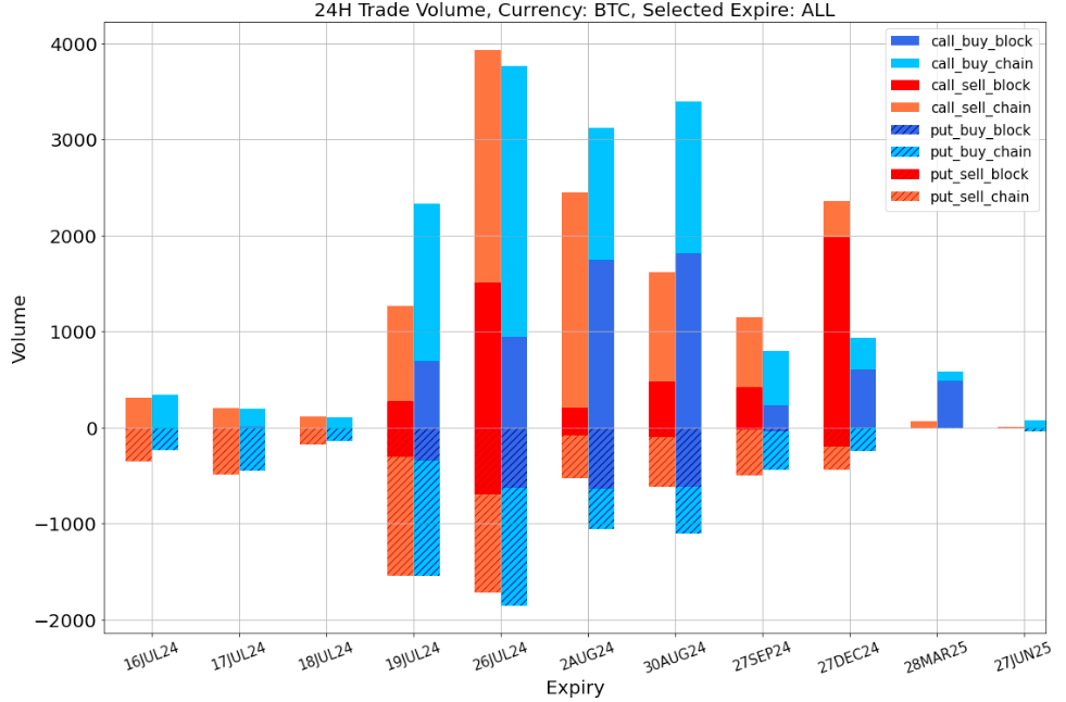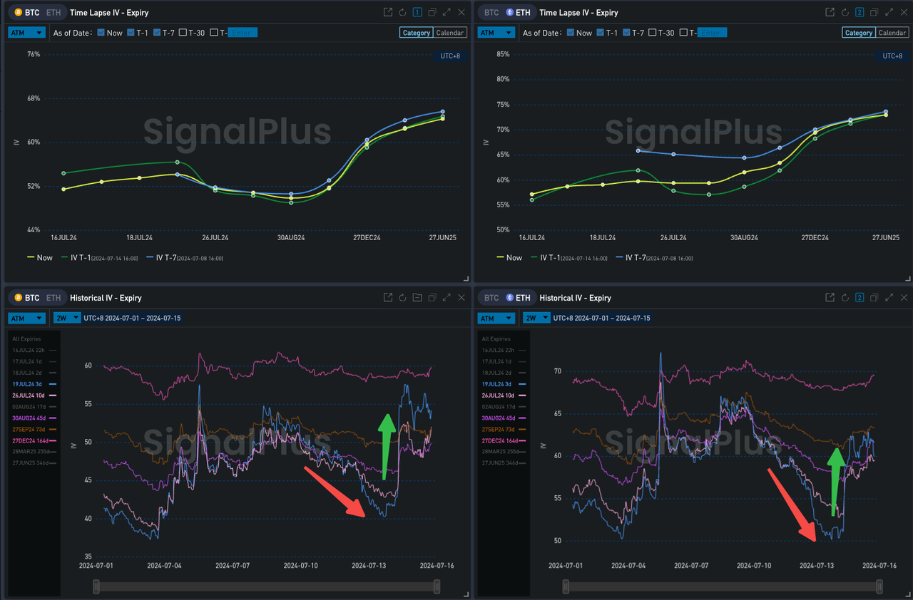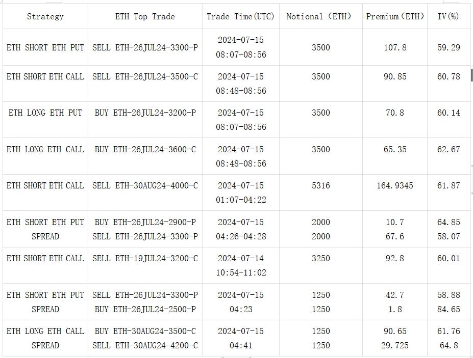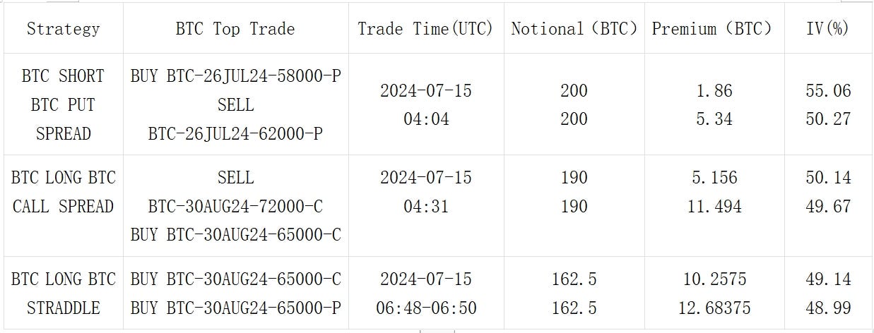 From ETH’s perspective, the U.S. Securities and Exchange Commission (SEC) postponed the approval dates for several spot Ethereum ETFs from July 18 to July 23, continuing the trend of previous delays. Despite this, the community remains optimistic, believing that regulatory acceptance of crypto products is increasing and expecting significant capital inflows into the digital currency market. Consequently, the implied volatility (IV) for ETH options expiring at the end of July and early August rose by about 2%. Notable options strategies in the block market, such as the 26JUL24 3600/3800 Long Call Spread (3100 ETH per leg) and Buy 2Aug 3700-C vs. Sell 30Aug24 4000-C (7375 ETH per leg), reflect a positive outlook for short-term price gains.