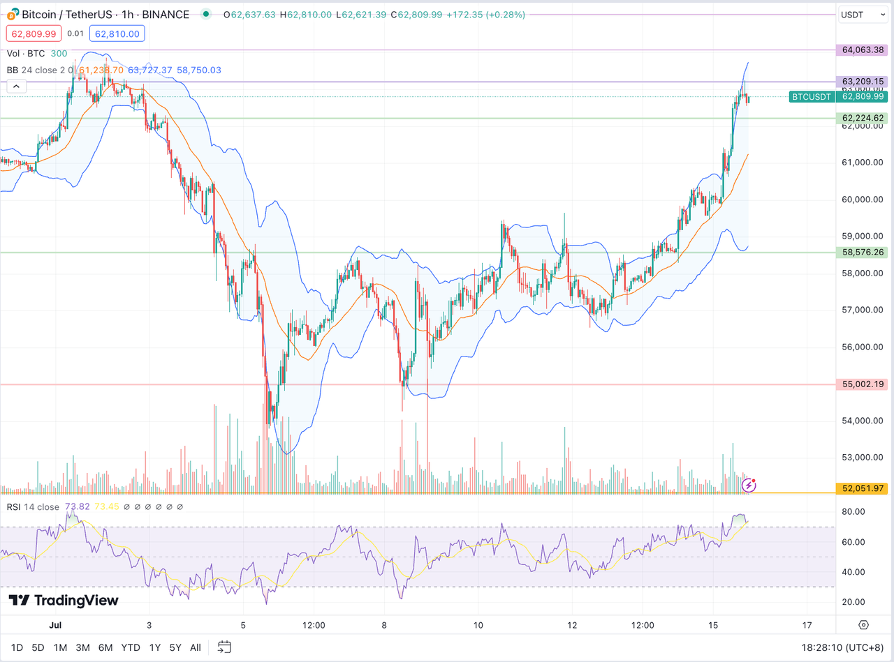 However, as the Bitcoin community celebrated the price challenging the $65,000 mark, Arkham data revealed that a Mt. Gox wallet address transferred 0.021 BTC to what appears to be a new address, possibly as a test transaction. This sudden market sentiment shift caused the price to briefly drop below $62,500. After the initial panic subsided, it rebounded to around $63,500, settling back to the middle line of the Bollinger Bands.