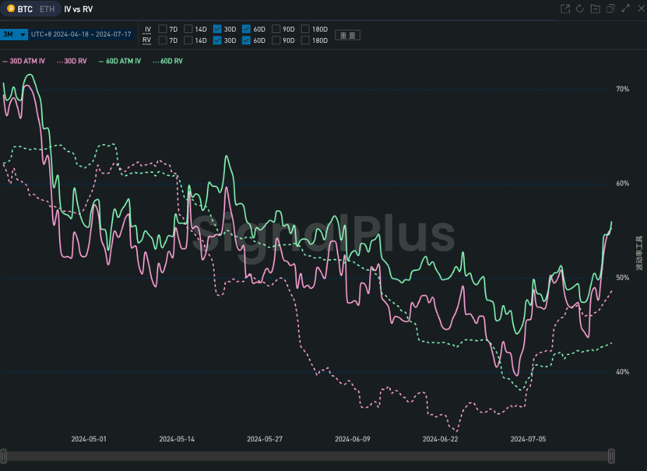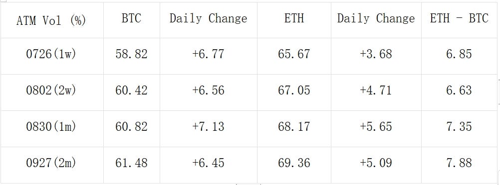 From a volatility perspective, the mid-to-long end IV levels have significantly increased over the past 24 hours. The trend of a flattening BTC term IV curve has become more pronounced, with IV for August and September reaching high levels above 60%, surpassing the 75th percentile of historical values over the past three months. The IV vs RV chart also shows that 30-day and 60-day IV has risen sharply, indicating a substantial volatility premium compared to RV.