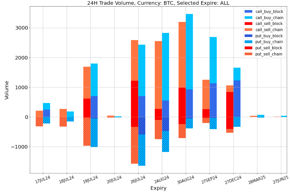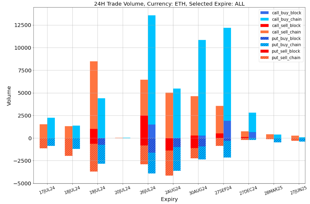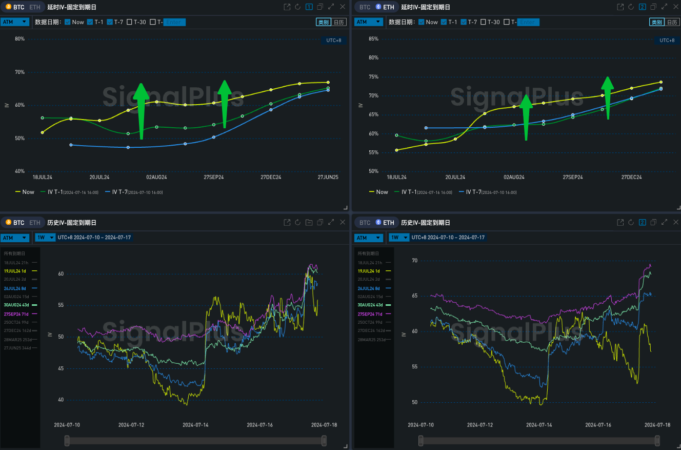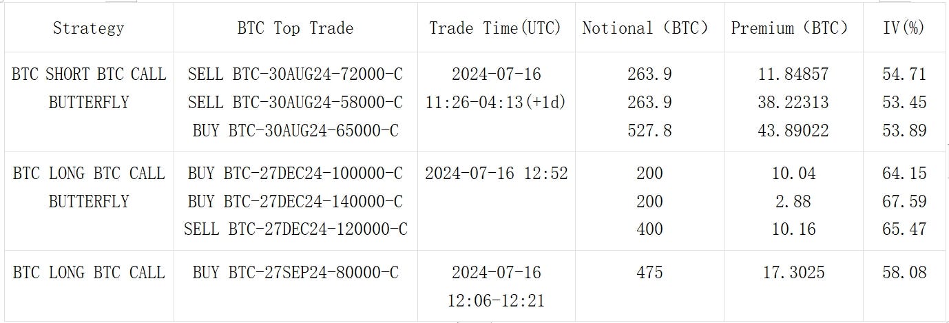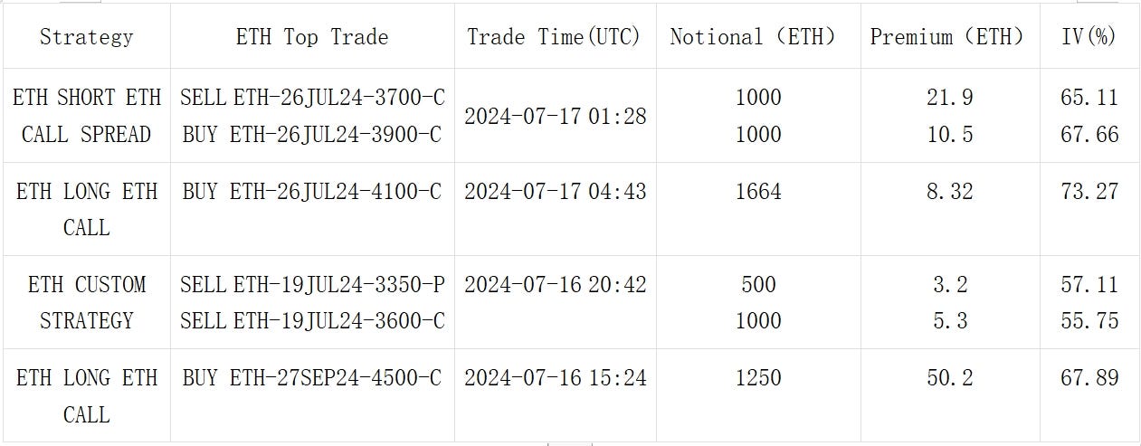 On the ETH front, the U.S. Securities and Exchange Commission (SEC) has officially announced preliminary approval for Ethereum spot ETFs for asset management firms such as BlackRock and VanEck, with trading slated to commence next Tuesday (July 23). This announcement has further bolstered the digital currency market, prompting traders to purchase a substantial number of call options expiring after the end of July, while concurrently selling call options expiring on 19JUL24 (prior to the start of ETH Spot ETF trading), thereby creating a calendar spread strategy.