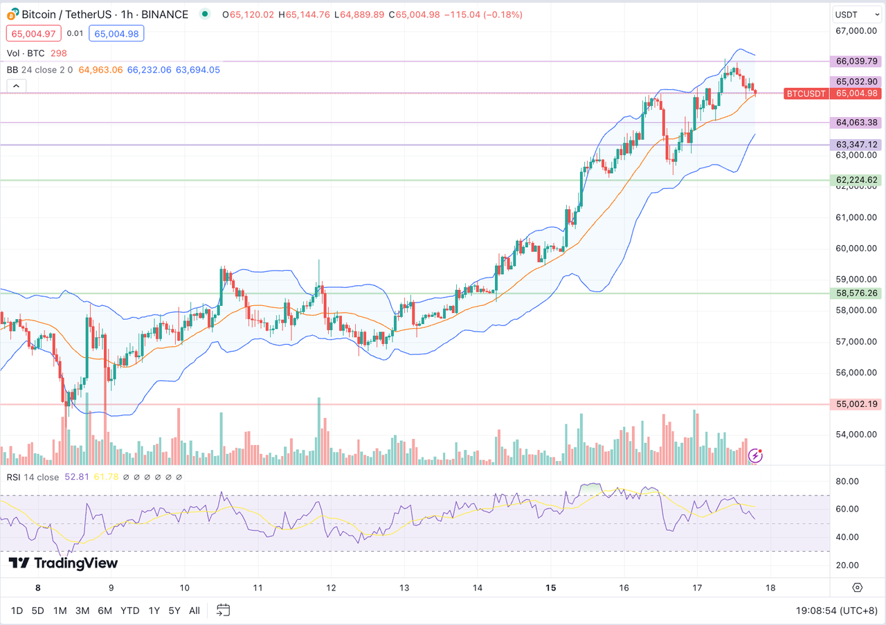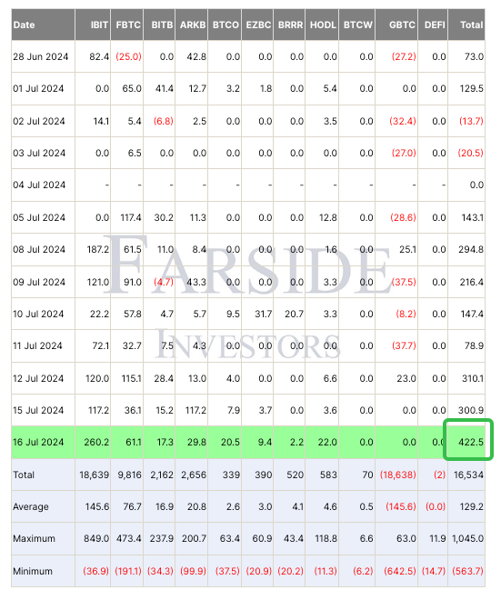 Over the past day, BTC prices have been on a steady rise, peaking at over $66,000 at one point. Spot ETF inflows hit $422 million in a single day, marking the highest since June, and cumulative inflows have surpassed $1 billion over the last three days. This trend signals growing investor confidence and heightened institutional interest in investment.