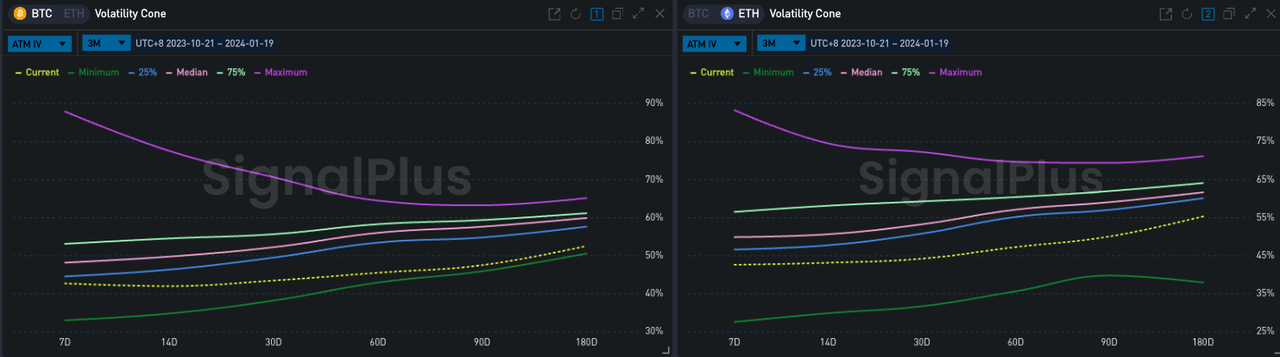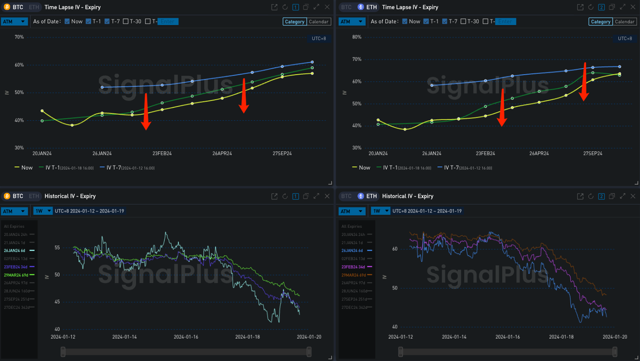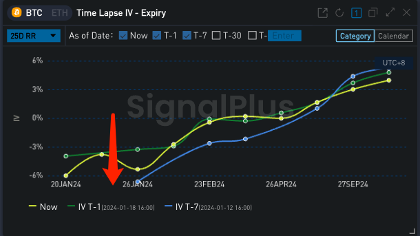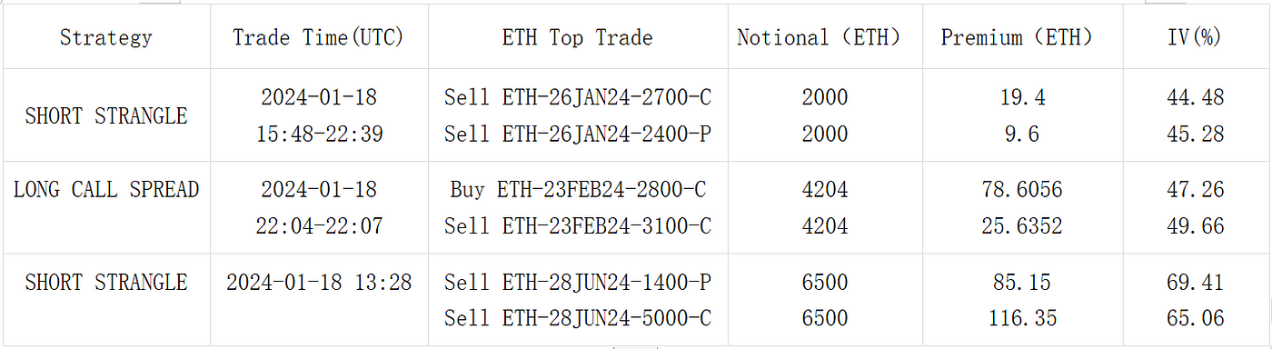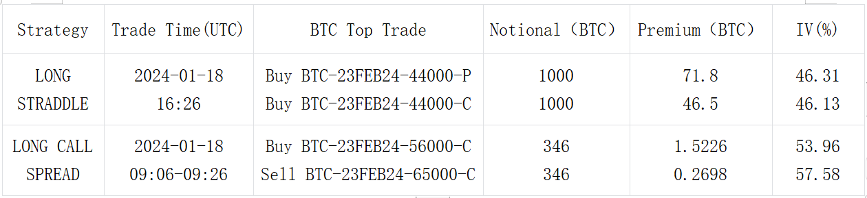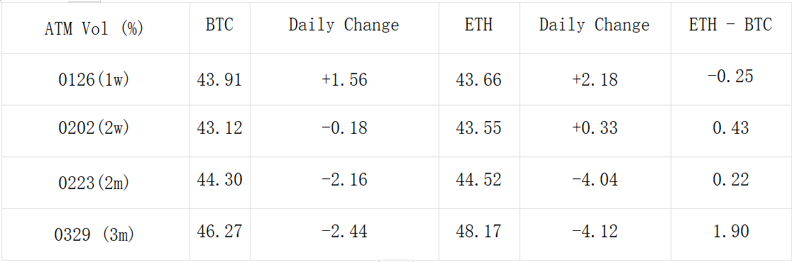 In the options market, over the past 24 hours, the distant IV for both BTC and ETH has again decreased by about 2% and 4%, respectively. BTC’s overall level has almost reached the lowest point of the past three months. Meanwhile, in trading circles, several Short Strangles of bearish volatility for ETH were observed for January and the end of June. However, the situation was opposite for BTC, where traders chose to buy low at 23 Feb 44000 Straddle, a bullish volatility position, near the lowest point of the term surface for the past three months. Additionally, trading at the end of January was most active, with a clear market tendency for buying puts and selling calls, leading to a 25-day dRR downward move of about 2% to the low point of the Vol Skew curve.