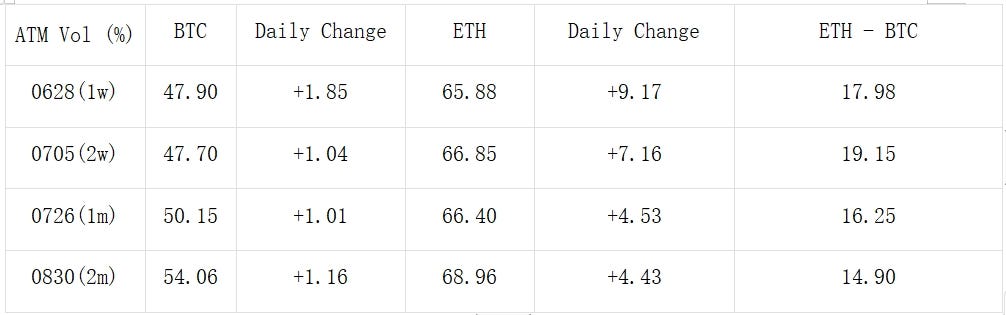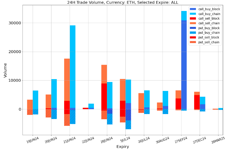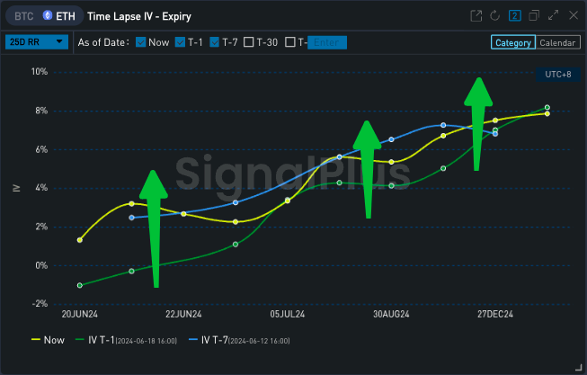 In the options market, influenced by macro news, the ETH options implied volatility curve has flattened and risen, reaching around 65% overall. Large bullish options trades are active, notably with the purchase of a total of 30,500 contracts for the long-term 27 SEP 24–4000-C, and a single purchase of 7,000 contracts for the 28 JUN 24–4000-C. Weekly call options are also popular among retail investors, buoyed by the price increase, pushing the overall smile curve towards call options.