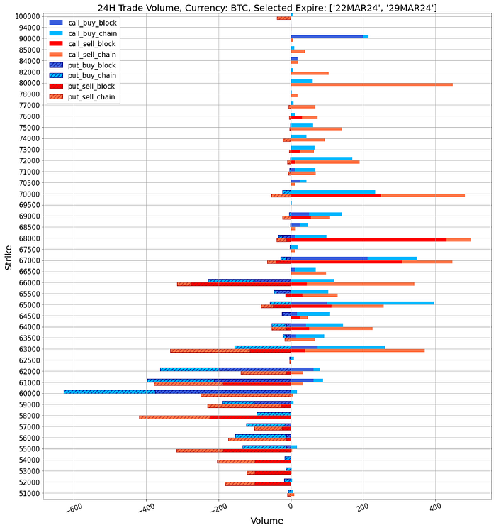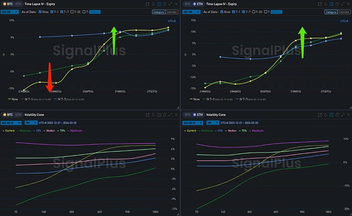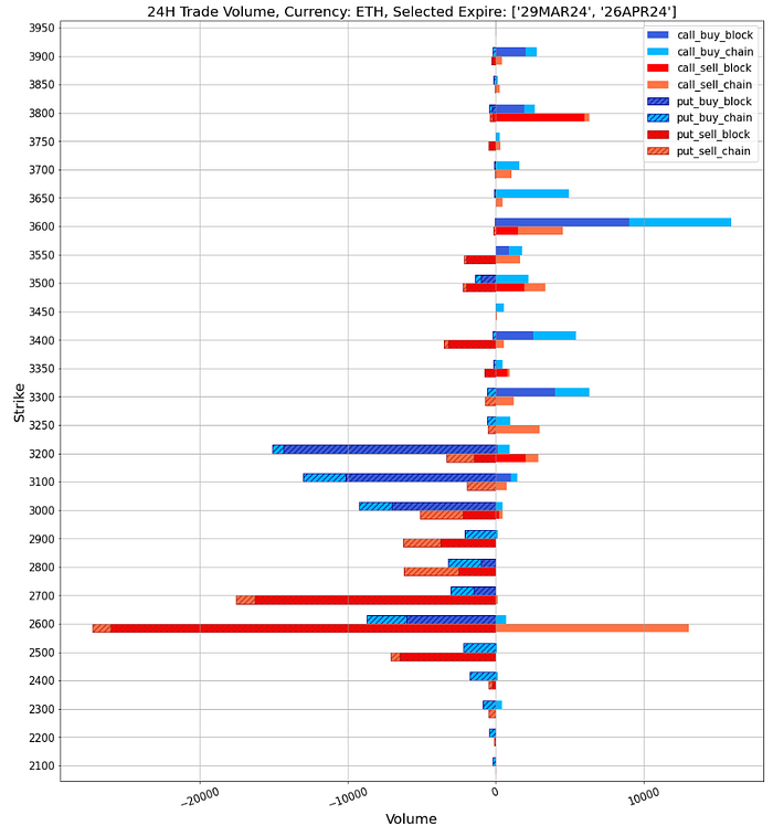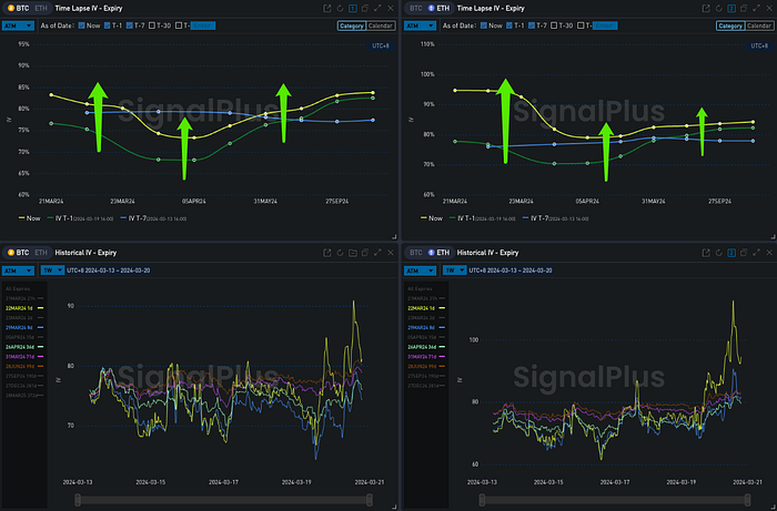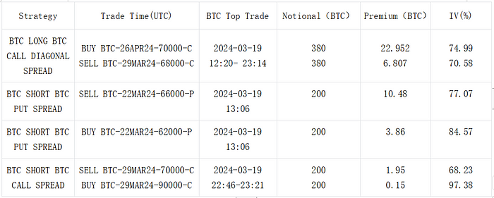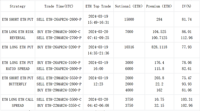 In the realm of digital currencies, it was yet another challenging day, with BTC/ETH falling below the $63,000 and $3,300 marks, closing at 62,778 (-2.52%) and 3,198.3 (-4.45%), respectively. The implied volatility saw a sharp increase, with ETH showing weaker performance and higher actual volatility compared to BTC, resulting in a Volatility Premium difference. The overall level reached above 80%. From a transactions perspective, ETH’s trading concentrated at the end of March and April formed a Long Put Spread protection, with significant numbers of Call buying strategies at dips also observed around the $3,600-C mark; similarly, BTC saw a distribution of transactions close to Long Put Spreads by the end of March. Besides, a significant amount of bullish options were sold off and shifted towards the $70,000/$100,000 positions by the end of April, forming a bullish call spread strategy.