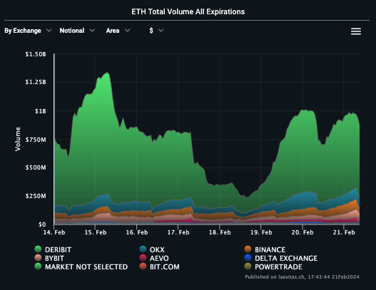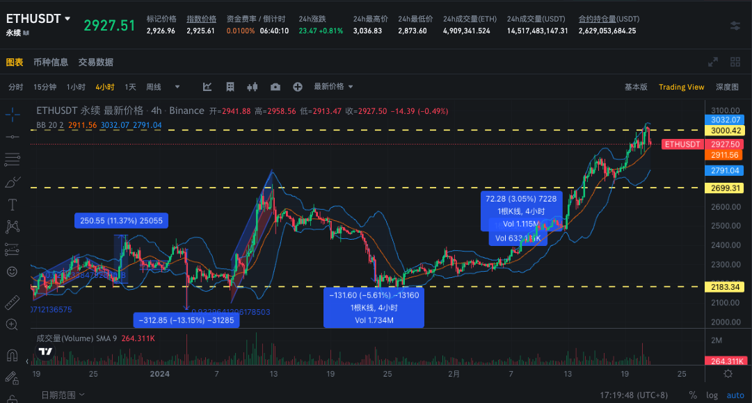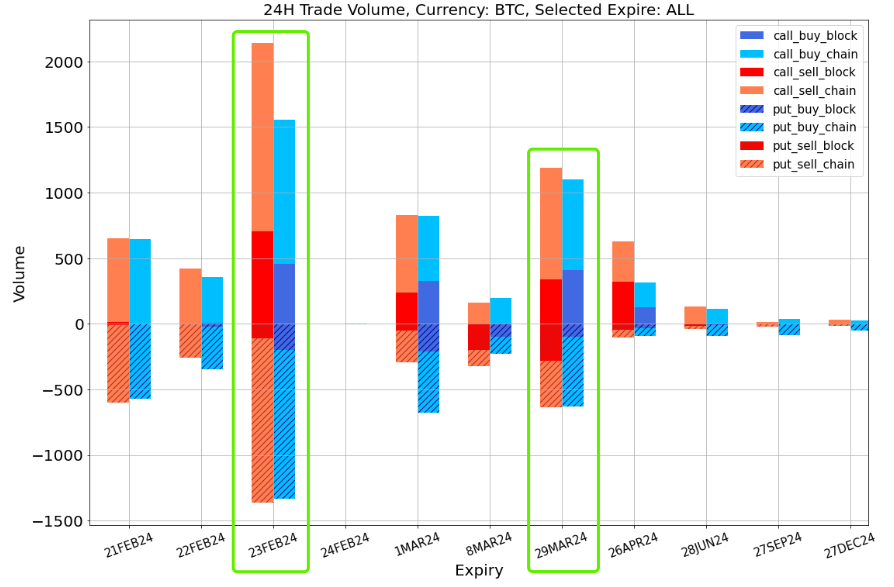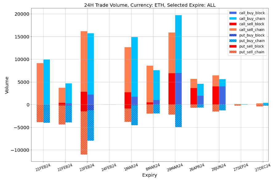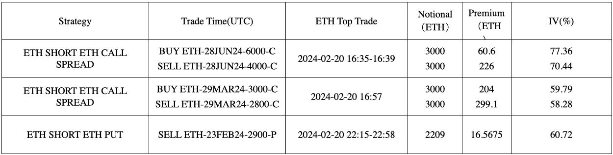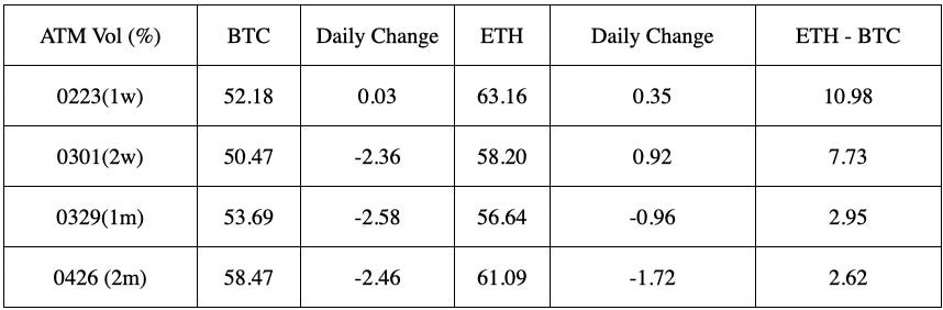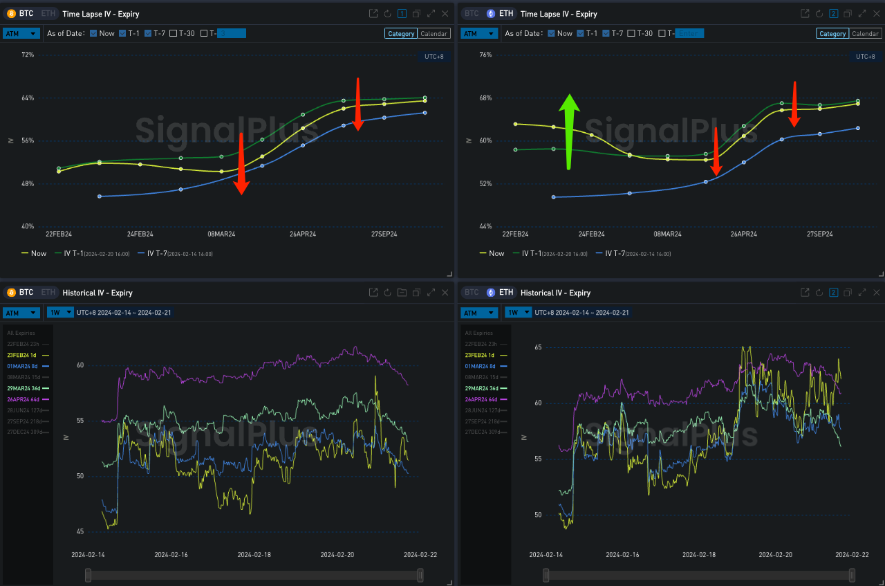 In the realm of digital currencies, after Ethereum touched the 3000 level again, it led to a pullback in Bitcoin with both currently oscillating above 51000 and 2900 respectively. Regarding options trading, in the past 24 hours, far-end implied volatility has generally decreased by around 1–2%Vol. ETH’s overall IV level is more than 2.5%Vol higher than BTC’s, especially the front-end IV showing a noticeable increase under the stimulation of challenging the 3000 level. However, option trading volume has not shown a significant increase, with a significant portion of yesterday’s ETH trading focusing on the game around the 3000-C across various maturities.