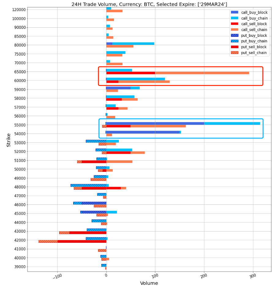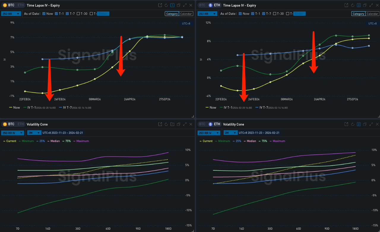 Additionally, alongside the price pullback, a decrease in Volatility Skew from its historical highs has been observed, with the front-end even dropping below zero. Apart from the common positive correlation between the Skew indicator and prices statistically, from a trading perspective, the significant selling of Call options in BTC in the short term, or the formation of Long Call Spreads (Buy ATM Sell OTM) on 29MAR24, partially explains the decline in the 25d Risk Reversal.
