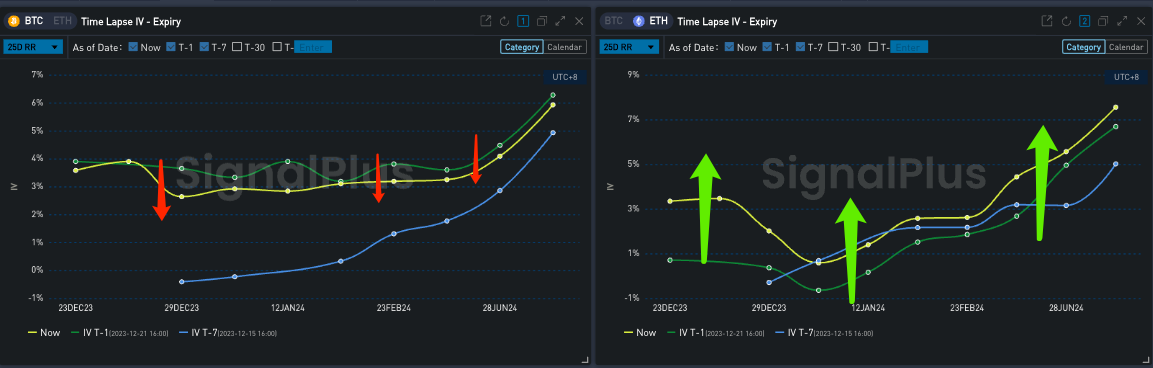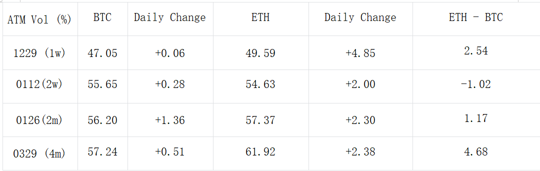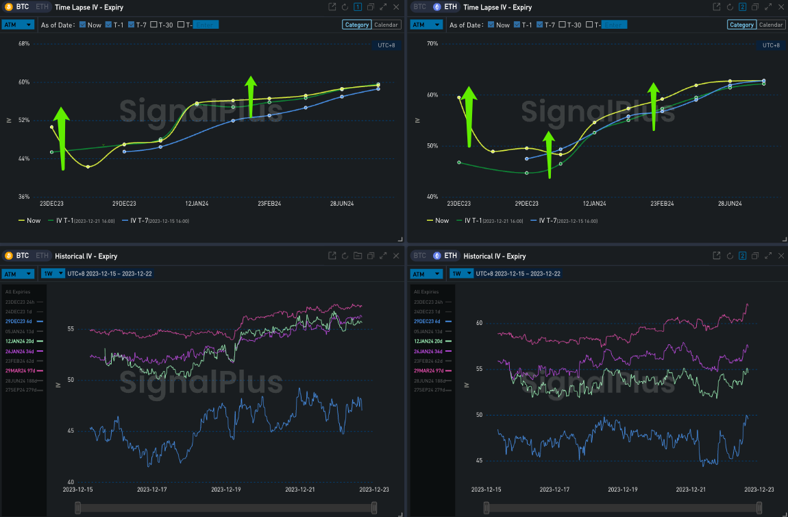 In the cryptocurrency sector, BTC continues its upward trend, repeatedly challenging the $44,000 mark. In terms of options, partly influenced by several macroeconomic data releases tonight, the IV for short-term options has strongly increased, with BTC and ETH currently reaching levels of 50% and 60% respectively. On the other hand, rumors about the launch of an ETH ETF next year are becoming more widespread, possibly contributing to today’s increase in distant IV by 2% Vol and a noticeable rise in Vol Skew.