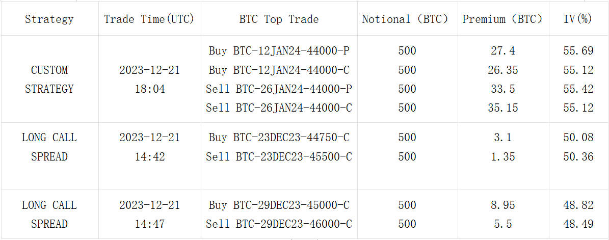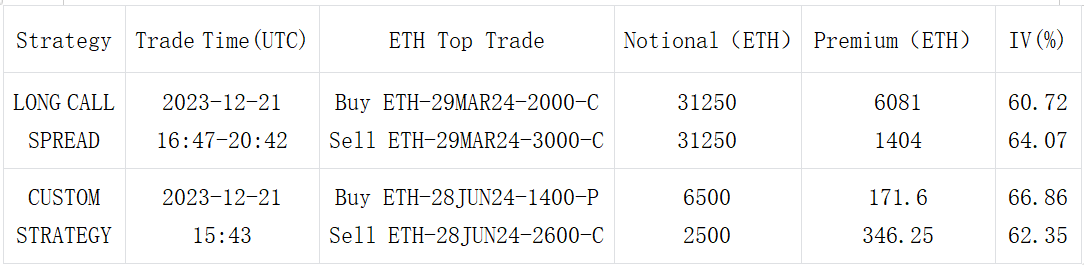 In the area of large transactions, the volatility trend in January remains a hot topic of market discussion. On the Deribit trading platform, a set of 500 BTC per leg ‘Buy 12 Jan Straddle vs Sell 26 Jan Straddle’ cross-period volatility spread strategies emerged, continuing to bet on the early-year dynamics of the SEC. At the same time, at the end of January, there is a 1000:2000 BTC ‘Sell 40000-P vs Buy 37000-P’ bearish spread, costing about 0.001 BTC per set. In terms of ETH, the ’29 Mar 24 2000 vs 3000 Long Call Spread’ leads the trading volume charts, with a total of 31,250 ETH traded per leg and an OI increase of approximately 22,030/29,400 ETH respectively.