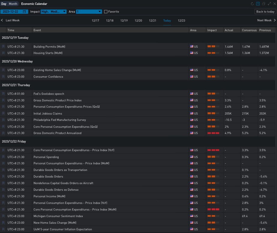 Yesterday evening (21 Dec) at 11:30 PM (UTC), the U.S. Department of Commerce reported that the annualized quarter-over-quarter value of the U.S. GDP for the third quarter was unexpectedly revised down to 4.9%, indicating that the growth for the quarter was not as strong as anticipated. This prompted a short-term decline in Treasury yields. However, at the same time, the number of initial jobless claims for the week was reported at 205,000, lower than the expected 215,000 and remaining near historical lows, showing the resilience of the labor market. After digesting this round of data, Treasury yields quickly recovered, with the two-year and ten-year yields currently at 4.346% and 3.891%, respectively. The three major U.S. stock indices opened high and closed higher, with the Dow Jones, S&P, and NASDAQ rising by 0.87%, 1.03%, and 1.26%, respectively.