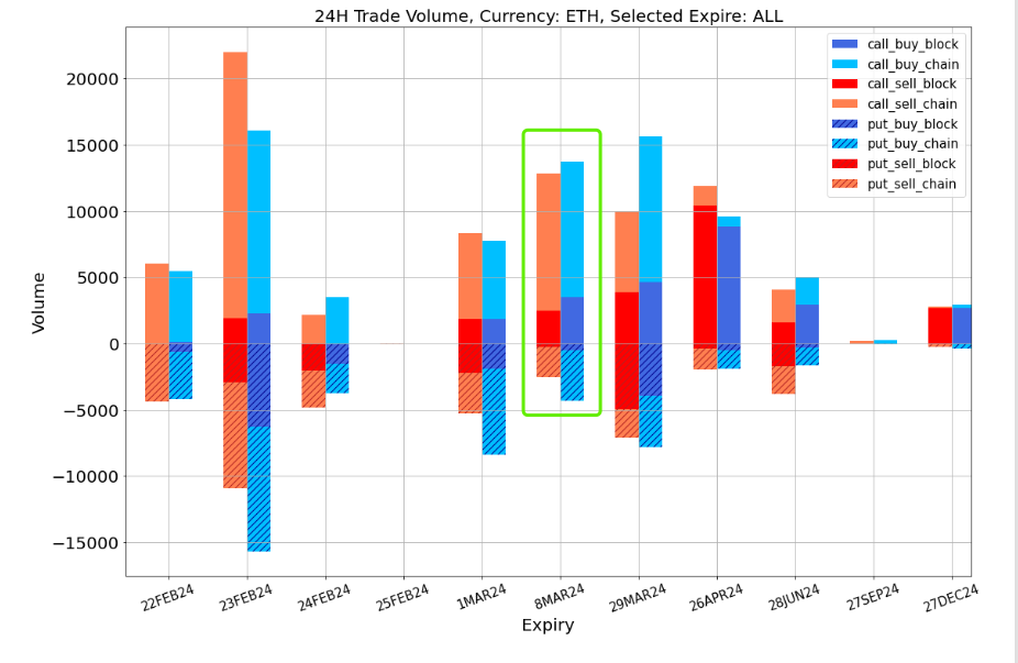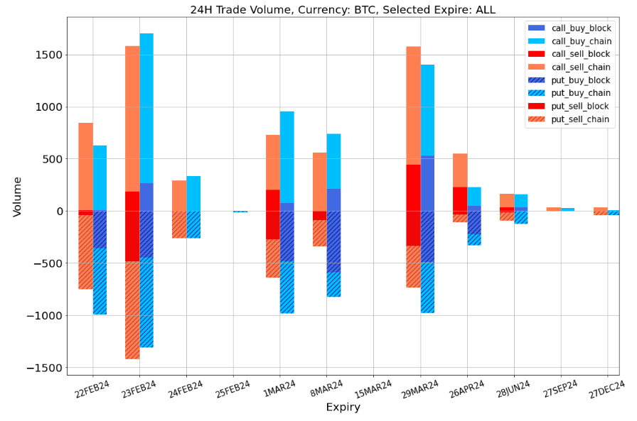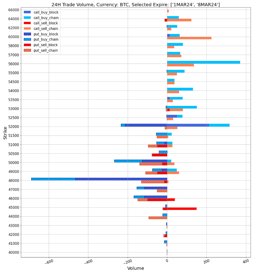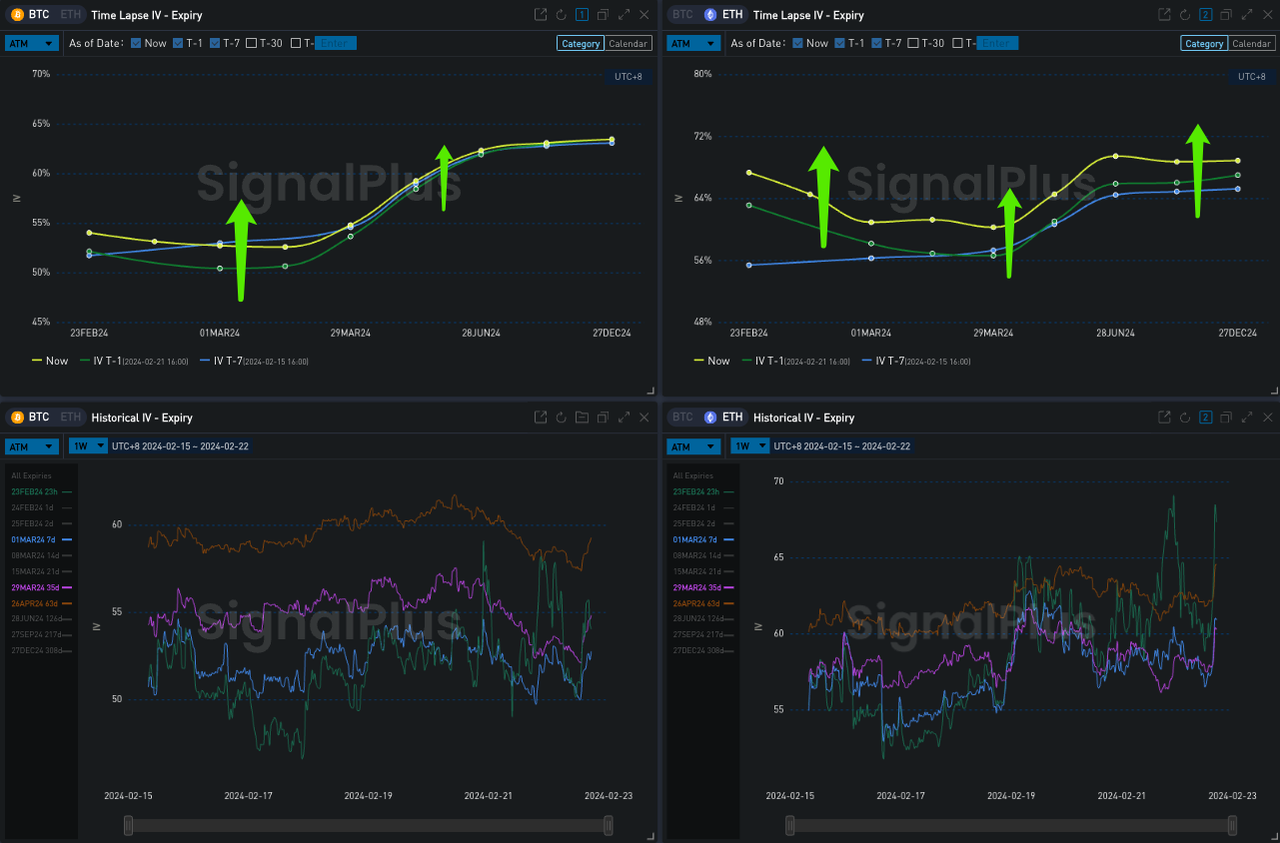 In cryptocurrencies, after a pullback yesterday, ETH has reclaimed the $3000 threshold. The overall implied volatility remains elevated, increasing by 2–3% Vol to nearly 60%. In trading activities, a significant amount of call options around the 3100–3200 range for 8MAR have been heavily bought, becoming the most prominent range for open interest growth in the past day. Similarly, in early March, BTC options have also seen substantial buying, including Long 8MAR24 52000 Straddles on major platforms, as well as a large number of buy orders for the 48000-P and 56000-C options chains, collectively driving up BTC’s volatility in early March. On the other hand, a large-scale monthly expiration is approaching tomorrow. In the past 24 hours, the market has already closed positions early on 23FEB24, releasing margins in advance. For example, selling profit-taking orders for BTC 54000-C/58000-C and stop-loss orders for 2400-C ETH contracts totaling six thousand contracts.
