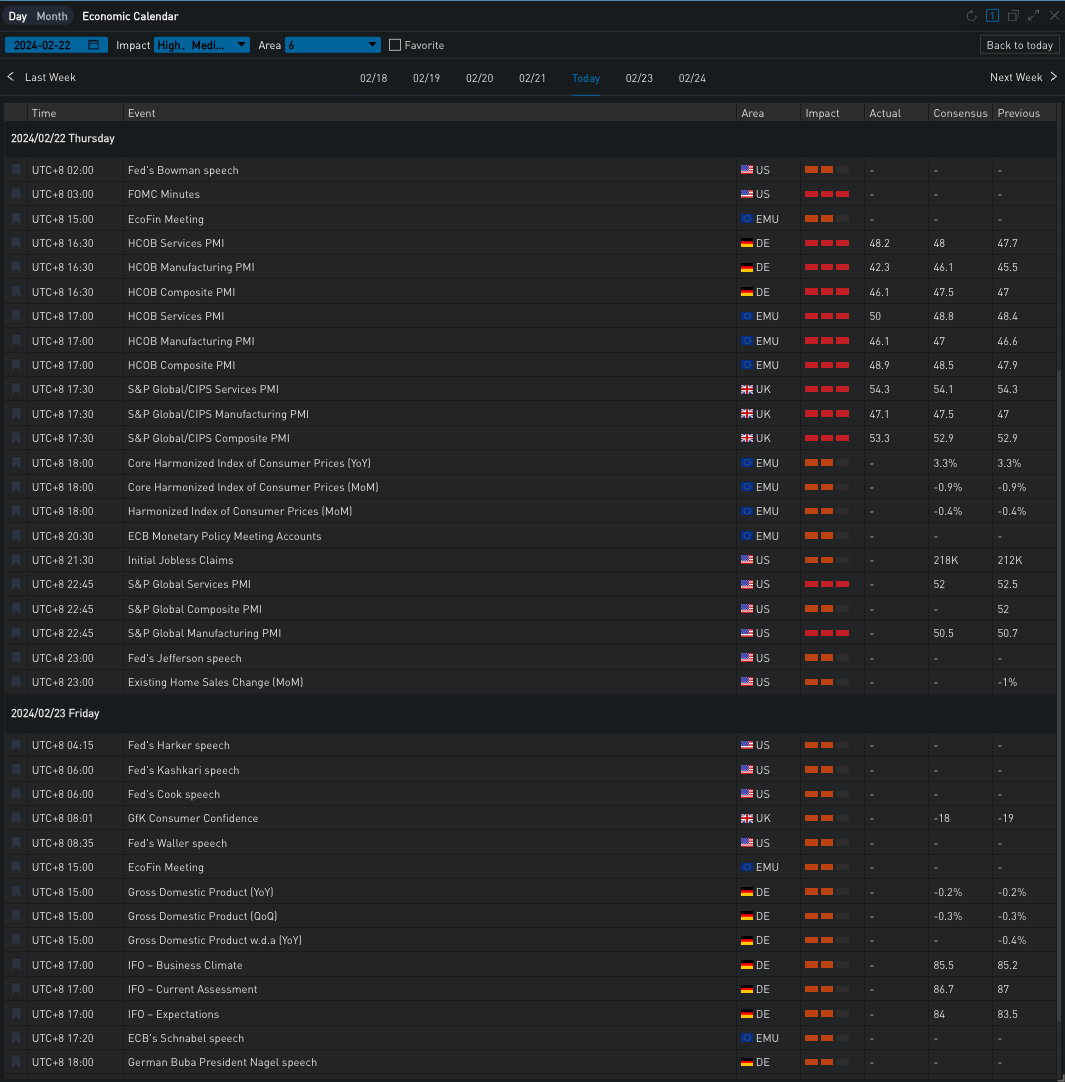Yesterday (21FEB), NVIDIA’s Q4 earnings report was just released after the U.S. stock market closed. The report indicated that due to a significant increase in demand for AI chips, the company’s revenue and profits in the fourth quarter surged year-on-year, surpassing market and analyst expectations. Jensen Huang mentioned that generative artificial intelligence has reached a tipping point, leading to NVIDIA’s stock price rising by over 10% in after-hours trading. On the other hand, the newly released minutes from the Federal Reserve once again weakened the market’s expectations of an early rate cut. U.S. bond yields gradually rose, with the two-year and ten-year yields currently at 4.669% and 4.306% respectively. The three major stock indexes showed mixed movements, with the Dow and S&P rising by 0.13% and the Nasdaq falling by -0.32%.