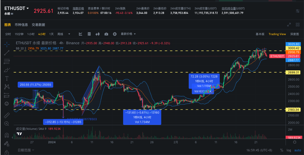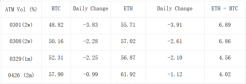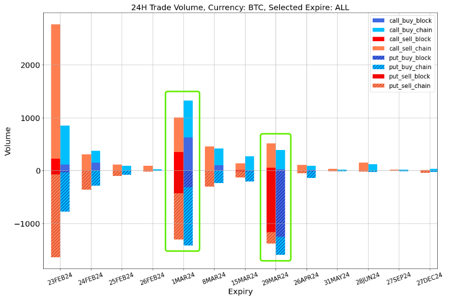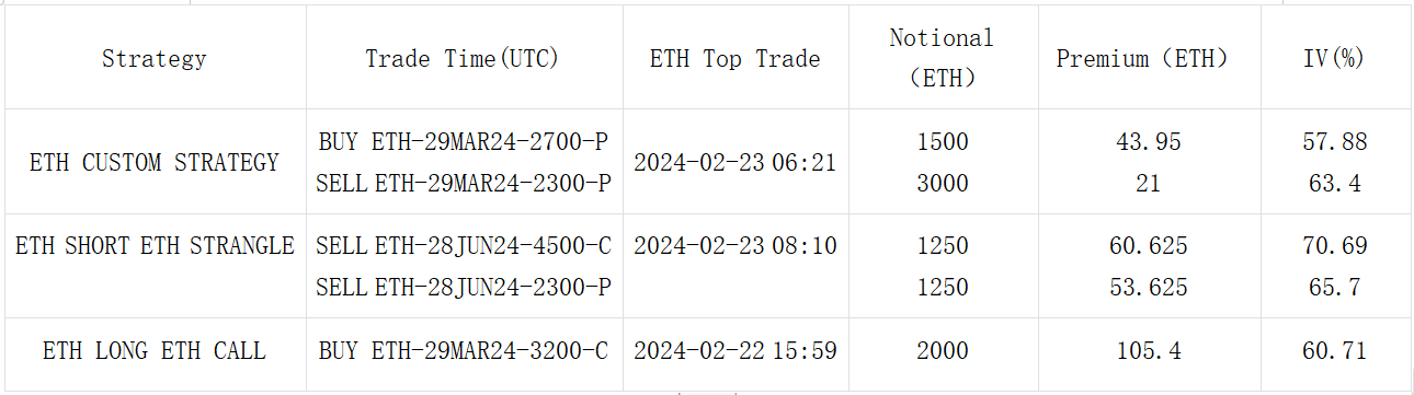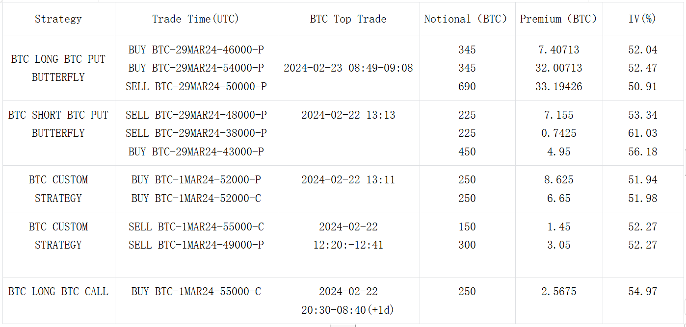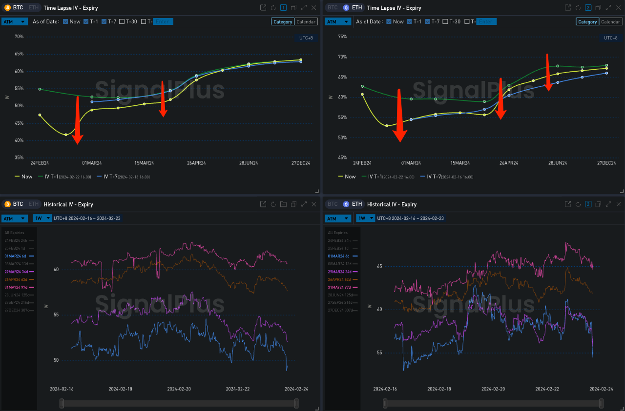 In cryptocurrencies, today marks the delivery day for options/futures at the end of February, unlocking a significant amount of margin that was tied up in the recent uptrend. Prices of BTC/ETH experienced a slight pullback, closing at 51000 (-1.6%) and 2933 (-1.8%), respectively. Regarding options, the implied volatility curve took a steep downturn, with ETH’s Vol Premium relative to BTC remaining unchanged. From a trading perspective, BTC transactions were concentrated on 1MAR/29MAR, with a significant increase in the proportion of put option transactions, primarily consisting of 1MAR 50000/49000 Long Put Spread and two sets of bearish put spread strategies for 29MAR, with accompanying charts illustrating the profit and loss changes for these strategies. Most ETH transactions were also concentrated in March, with the most notable net inflows being 3100/3200 call buying and 3000 put buying.