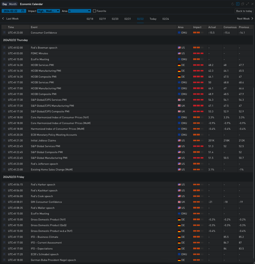 Yesterday (22FEB), the U.S. economic data showed strong performance, and Federal Reserve officials continued to pour cold water on expectations for rate cuts in the near term: the number of initial jobless claims for the week was recorded at 201,000, lower than the expected 218,000, and the Markit Manufacturing PMI unexpectedly climbed to 51.5, higher than the expected 50.5. Philadelphia Fed President Harker issued a warning: the biggest risk is cutting rates too soon, with no urgent need to cut rates; Fed’s Jefferson also expressed concerns that an overly loose policy might lead to inflation reversing or stalling, considering a rate cut later this year might be appropriate. Consequently, U.S. Treasury yields gradually rose, with the two-year/ten-year now at 4.739%/4.343% respectively. The three major U.S. stock indices were boosted by Nvidia’s better-than-expected earnings report, with the Dow Jones/S&P 500/Nasdaq closing up 1.18%/2.11%/2.96%, respectively.