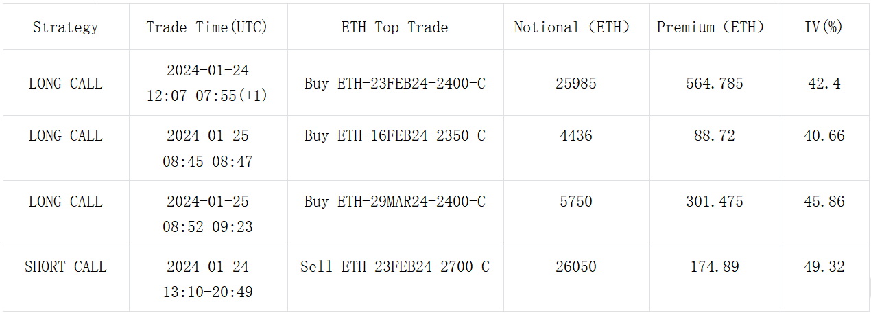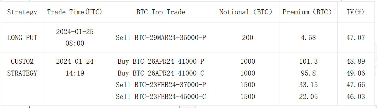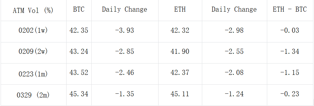 In terms of trading, there were a large number of call strategies traded in ETH FUTURES, with long strikes concentrated at 2300–2400, with the largest volume being the 23 FEB 2400 vs 2700 combination of Call Spread traded on the options chain, with single-leg turnover of around 26,000 ETH. The most prominent strategy in BTC is a customized strategy, selling 1500 sets of 23 FEB Stangle and at the same time buying 1000 sets of 26 APR Straddle, forming a cross volatility carry trade.