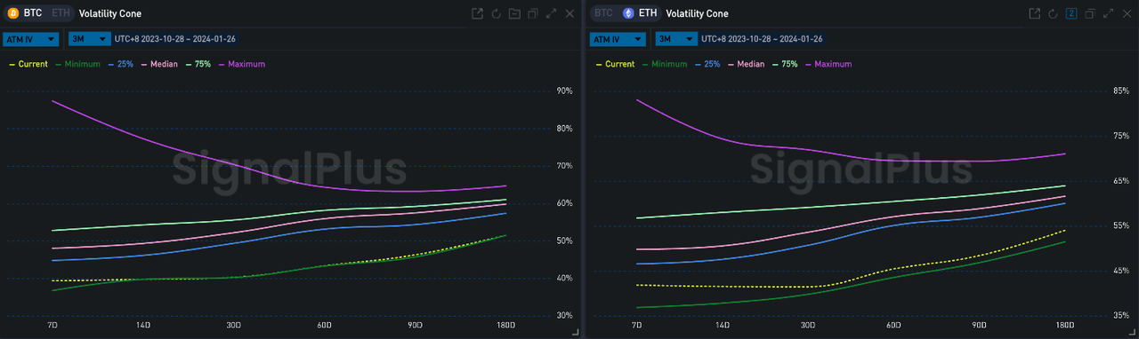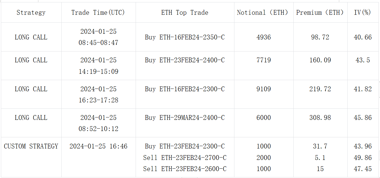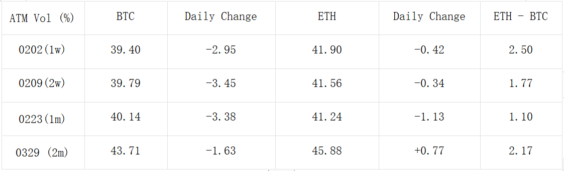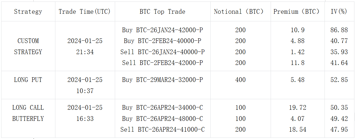 Digital currencies continued their narrow range fluctuations from the previous day, with the overall BTC Implied Volatility declining by 3% Vol, touching the lowest point of the past three months, while ETH slightly fell by 0.5%, overall slightly higher than BTC by 1 to 2% Vol. Due to the low market sentiment, the options trading volume gradually declined, with the past 24-hour trading volumes for BTC and ETH being 760M and 600M, respectively. ETH’s trading volume share increased significantly, mainly contributed by the large volume of bullish option purchases near the exercise prices of 2300–2400 for February and March; BTC transactions were relatively balanced, with the market focusing on the 40000-P play, including yesterday’s largest custom transaction, selling 200 sets of this Friday’s end-of-day 40000 vs 42000 Put Spread while rolling the same position to the next Friday (2 FEB), continuously showing a defensive stance against recent selling pressures from various factors including GBTC.