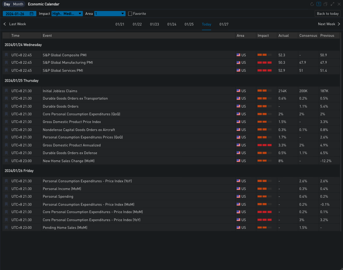 Thanks to strong government and personal consumption expenditure as well as the growth in inventories and exports, the GDP data released by the United States on January 25th recorded 3.3%, significantly exceeding the expected 2%, increasing the probability of a successful soft landing; in addition, initial jobless claims were recorded at 214,000, exceeding the expected 200,000, showing a continuous cooling of the U.S. labor market, and U.S. Treasury yields gradually declined overall, with the current two-year/ten-year rates at 4.308%/4.116% respectively. In Europe, the central bank maintained the interest rate unchanged for the third consecutive time, and President Lagarde expressed a dovish pivot stance through a statement, causing the 2-year German government bond yield to significantly drop by 12 basis points.