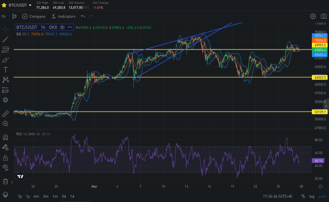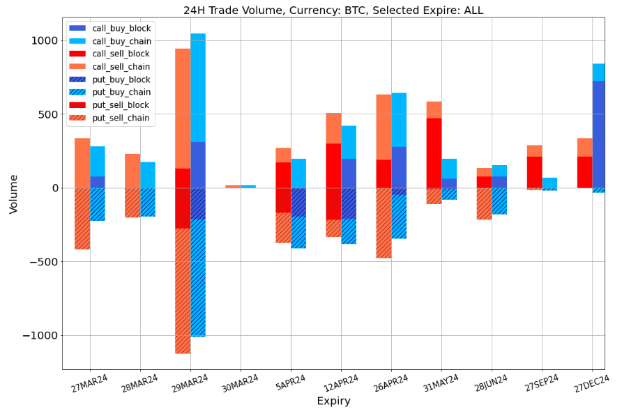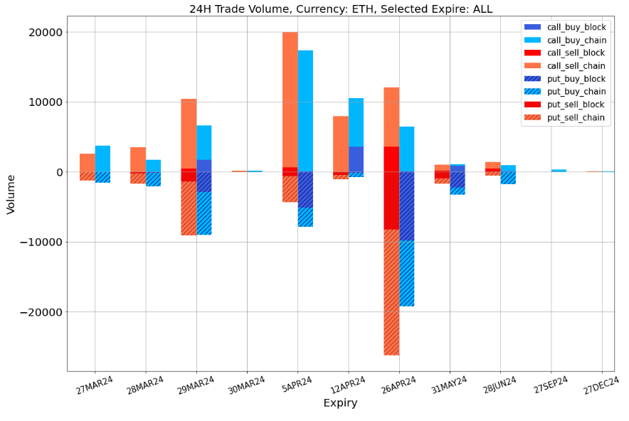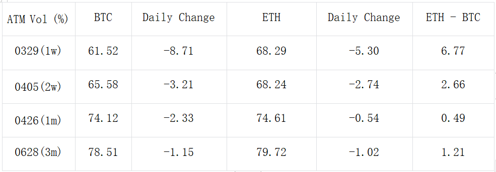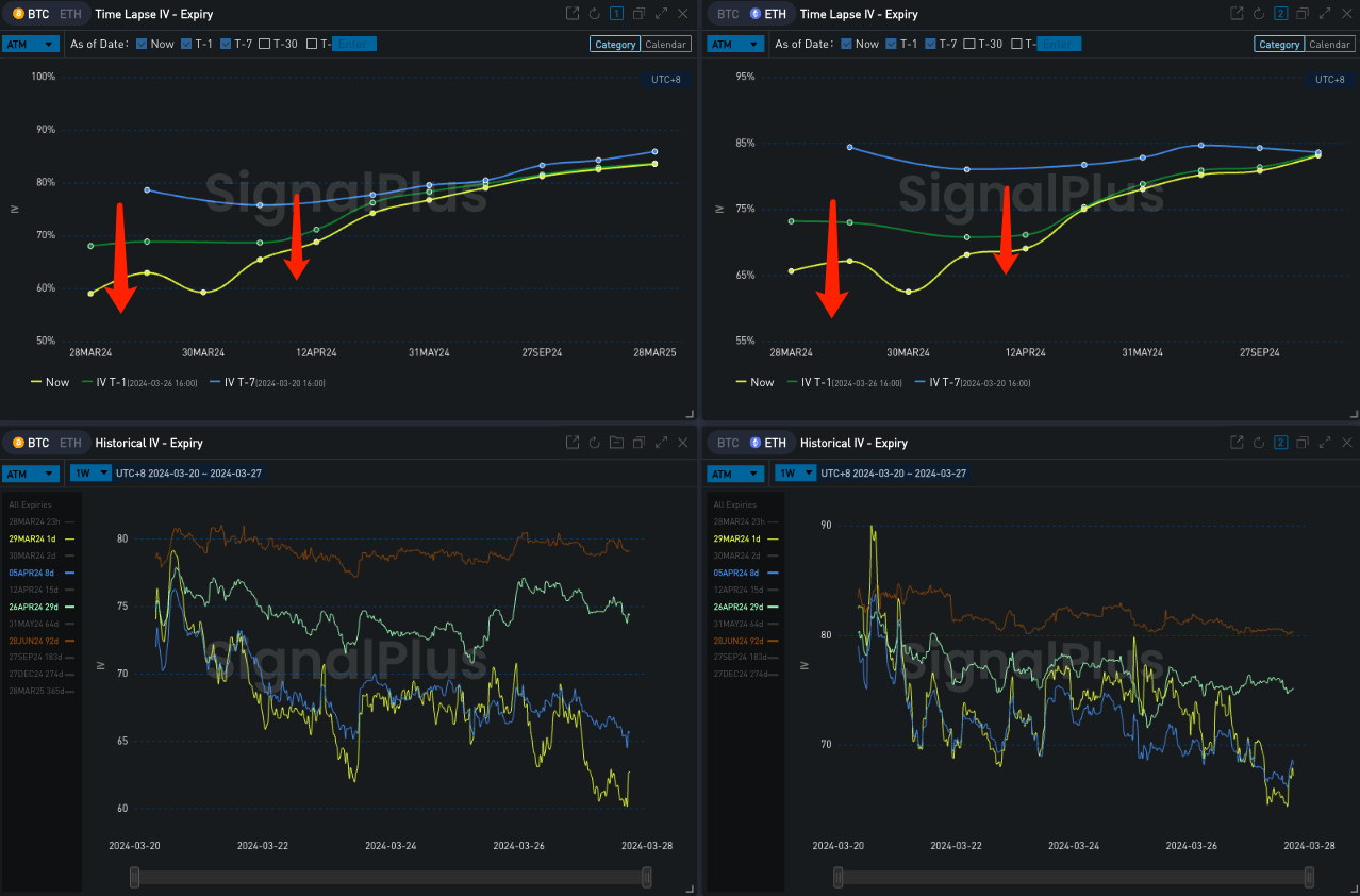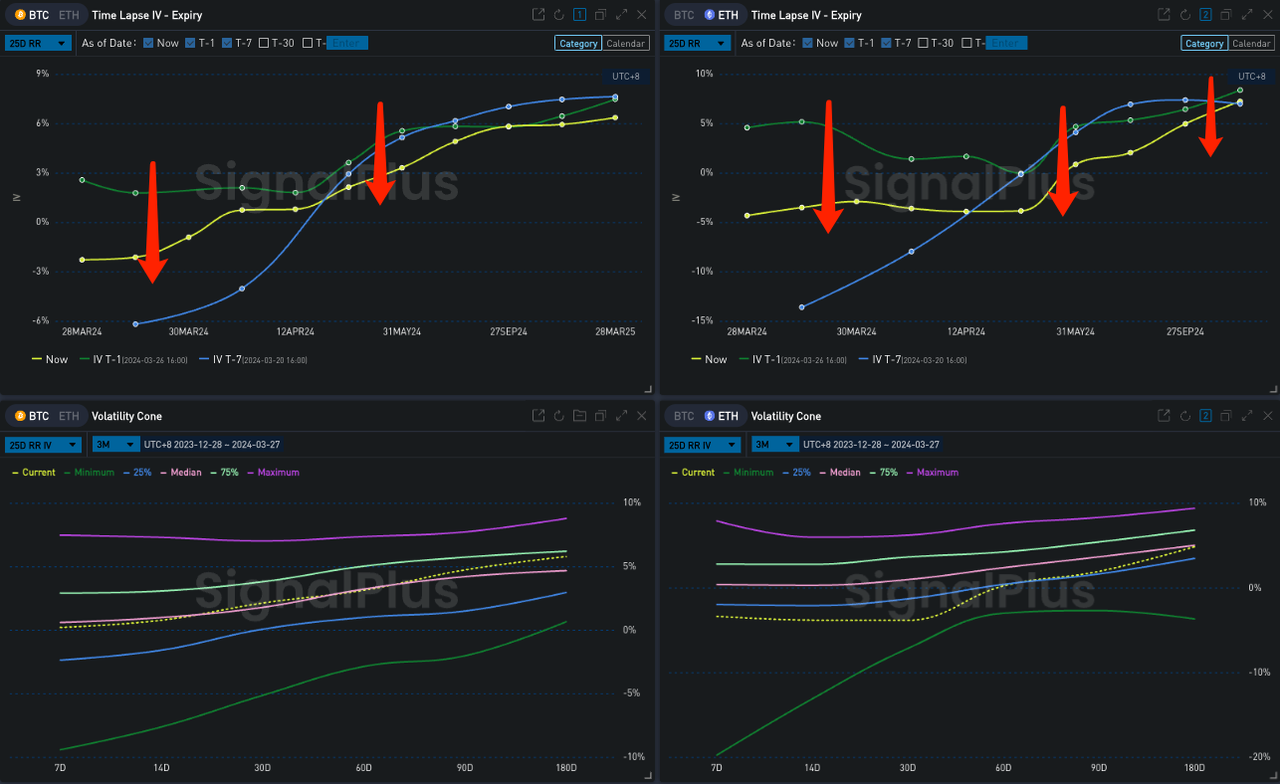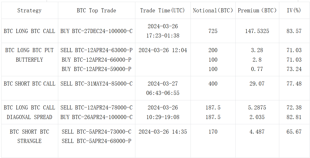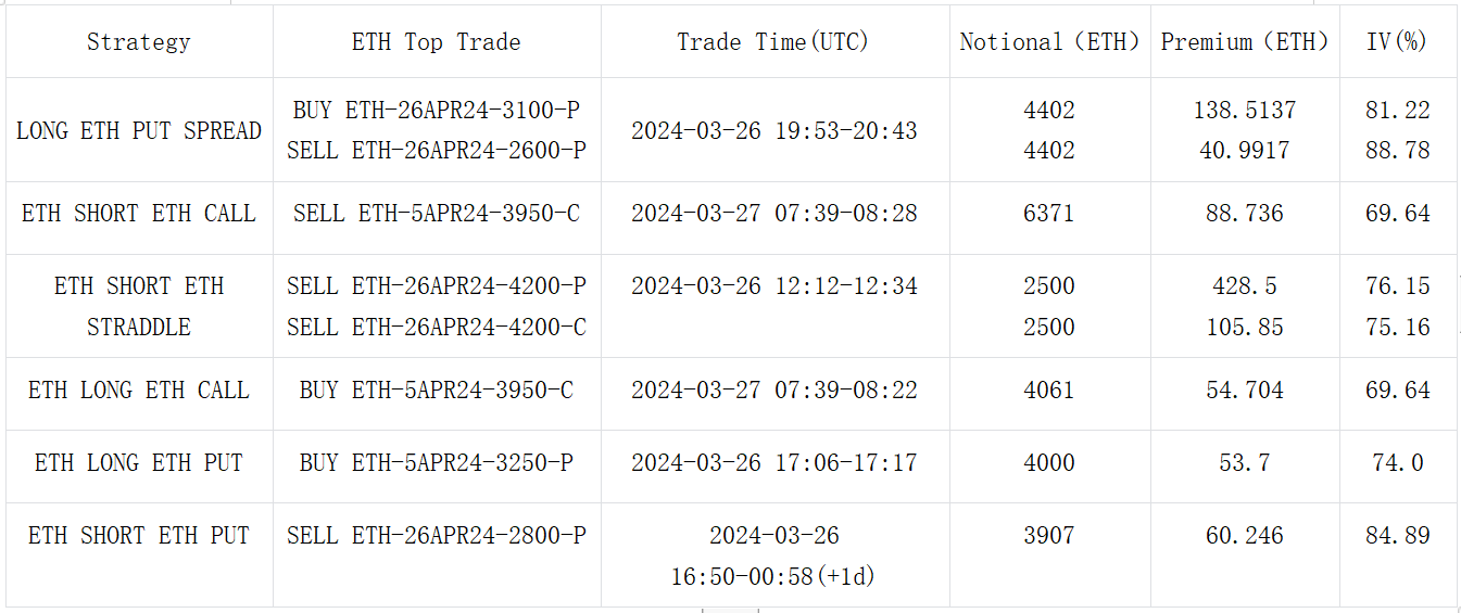 Digital currencies have temporarily paused their recent upward trend, with BTC and ETH experiencing minor fluctuations around $70,000 and $3,600 respectively for most of the past 24 hours, after a slight retreat from recent highs. The upward potential has become less clear, leading to a reduction in the implied volatility and Vol Skew in the options market at the mid-front end. Trading also reflects strategies indicative of bearish volatility and weakened upward momentum, such as BTC Short 31 MAY 24–85000-C, BTC Short 5 APR-68000/73000-Strangle, and ETH Short 26 APR 24–42000-Straddle. Besides, in both cryptocurrencies, short-term transactions are still predominantly defensive bearish spread strategies, with a part of BTC transactions shifting towards the mid-long term, among which the 27 DEC 24 100000-C option received a bulk purchase of 725 BTC, marking the largest open position yesterday.