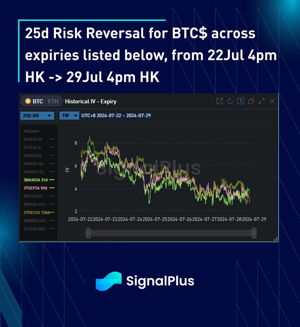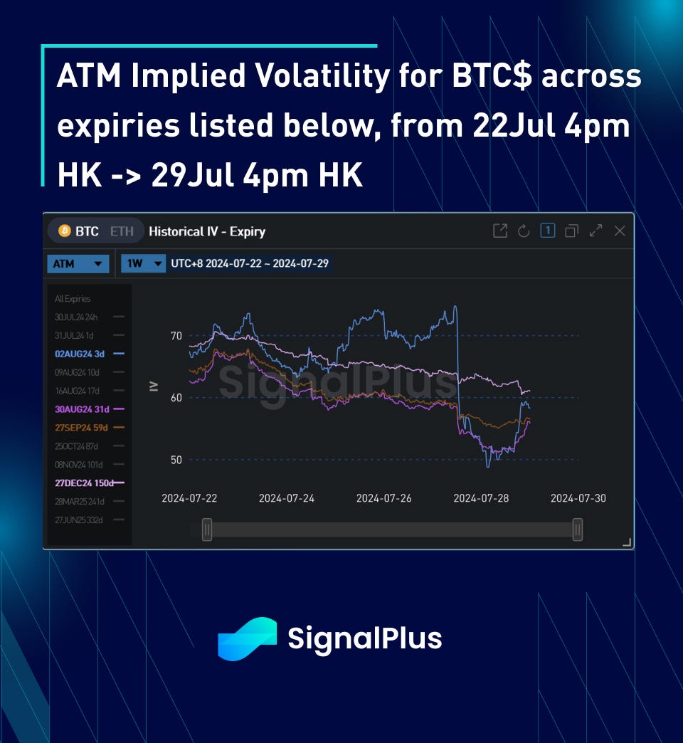 - Significant volatility in the level of implied volatility for shorter dated contracts this week, most notably over Trump’s keynote speech at Bitcoin 2024, as straddle premium for the event traded in a 4.0–5.5% range. With spot failing to clear 70k despite perceived bullish announcements, market saw a significant drop in IV post event for front contracts as we await a fresh catalyst to push spot higher. Crypto calendar is light for the week ahead, while focus will turn to Fed with market pricing 15% chance of a cut following recent trend in US data