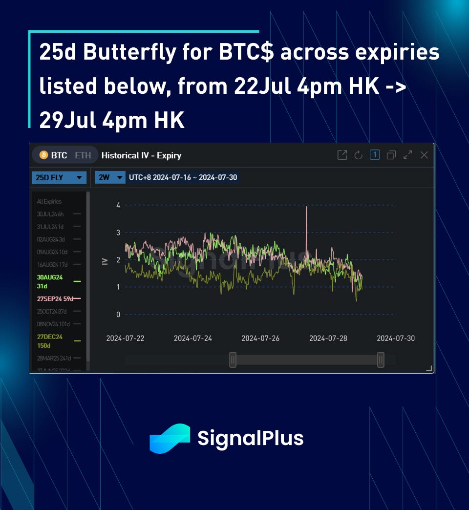 - Further out the curve (September onwards), implied volatility straight-lined lower despite BTCUSD spot breaking to fresh highs on the week, as the bullish narratives played out without too much fanfare and buying demand for longer dated topside subdued. Meanwhile, large supply of December topside strikes was also noted.