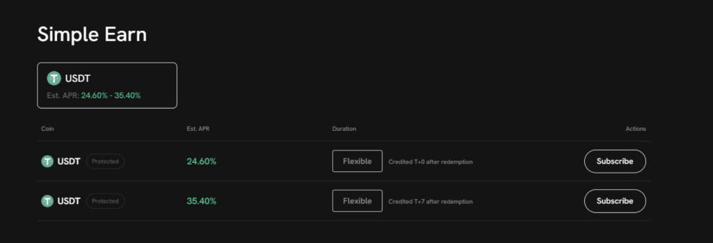 The chart shows implied volatility (IV) higher than realized volatility (RV) at 30 days, supporting options selling strategies. A covered call strategy (buying BTC futures and selling short-term calls) is well-suited for this high-volatility environment. Another option is Coincall’s Simple Earn program, offering an APR of 24.60% to 35.40% while waiting for the best strategy.