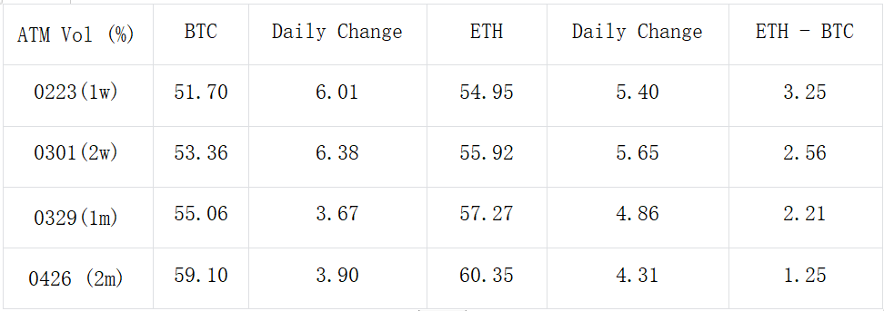In the realm of digital currency, BTC continued its upward momentum, rising by 4.1% during the day, successfully stabilizing at the $52,000 mark; ETH ended the day up 4.6%, nearing $2,800. In terms of options, the Volatility Skew remains at historical highs, with At-The-Money Volatility continuing its trend of oscillating upwards, reaching levels above 50% Volatility, with ETH being 2 to 3% Volatility higher than BTC.