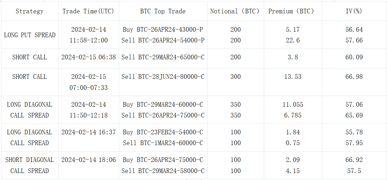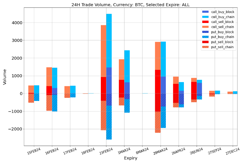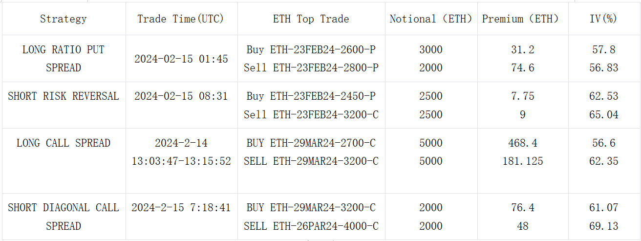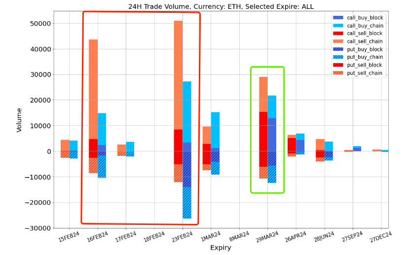 In trading, there was a significant sell-off in ETH calls for this week and the end of the month, including a large number of take-profit orders between $2,300 and $2,400. The end of March saw a concentration of bullish strategies, represented by buying the 2700 vs 3200 Call Spread. Additionally, there were strategies like buying a 29 MAR 3200-C vs selling a 26 APR 4000-C, a long-short calendar spread. Similar transactions can also be observed in BTC, for example, buying a 29 MAR 60000-C vs selling a 75000-C (350 BTC per leg).