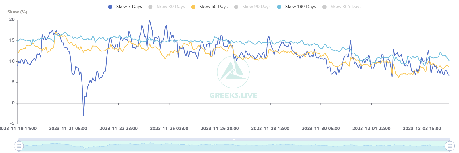 The market sentiment is overwhelmingly bullish, demonstrated by leveraged traders establishing new long positions and a high volume of shorts being liquidated. Despite this bullish trend, there’s an observable caution among traders taking profits, given the elevated volatility and price levels. ATM implied volatility has climbed since November 30th, and the skew continues to show a preference for calls, indicating a sustained bullish sentiment in the options market.