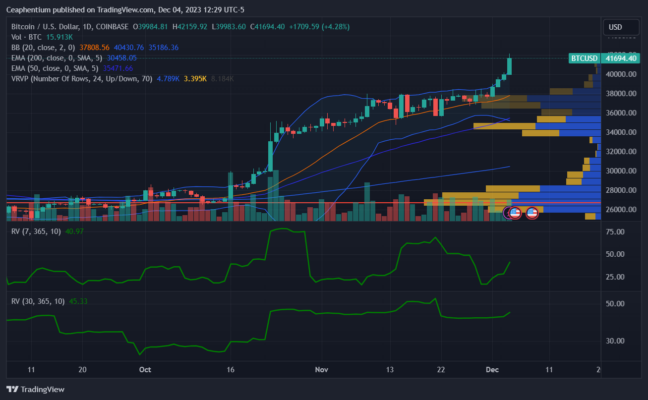 As we enter the first week of December 2023, the cryptocurrency market has experienced a notable surge, with Bitcoin (BTC) leading the charge. BTC has impressively broken the $40,000 barrier, reaching highs around $42,000. This movement is primarily BTC-led, as Ethereum (ETH) and most altcoins, despite being in the green, are slightly lagging behind. The spike in BTC’s price is attributed to a combination of factors, including increasing spot demand and a significant amount of short liquidations, amounting to approximately $160M.