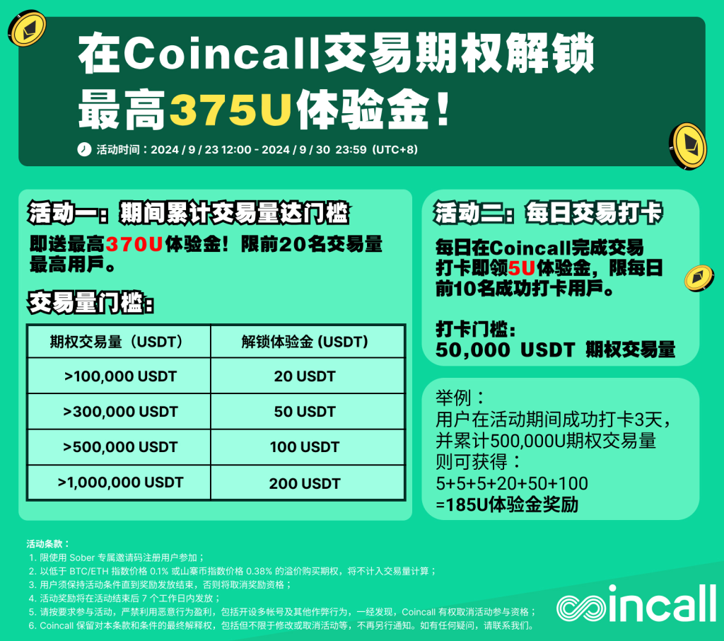 活动提示:如海报描述在Coincall交易最高 375U 的体验金,备注:需要用我的链接注册(见推特置顶)