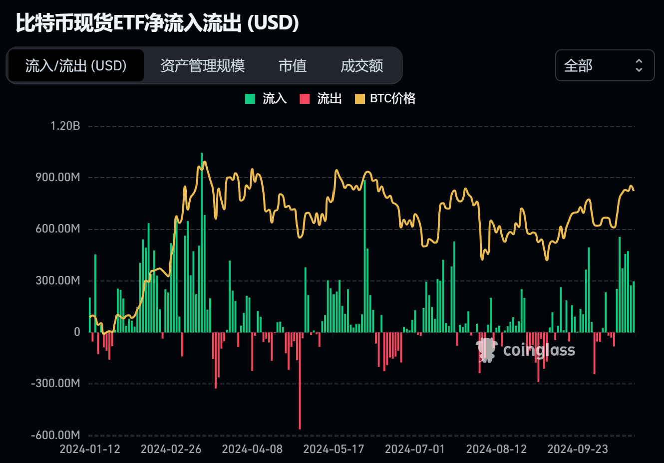 过去一周,美国比特币现货 ETF 持续大幅净流入,BTC 价格在周一上涨触及 $69,500 后开始回落,目前在 $67,000 附近盘整,随着美国大选日临近,市场整体情绪偏于乐观。
