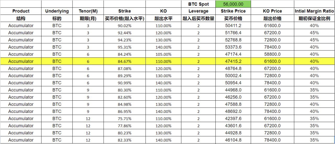 從歷史數據來看,BTC 在 9 月份的整體收益並不好,但在 10 月份會出現明顯上漲,BTC 在過去九年裡,有 8 個 10 月份顯示出正收益,平均漲幅高達 22.9%。 在 10 月份的潛在反彈和即將到來的美國大選之前,9 月份是累積 BTC 現貨的絕佳機會。如果 BTC 現貨價格低於 61,600 美元,每週使用 Accumulator 以 84.67% 的折扣價買入 BTC 現貨。