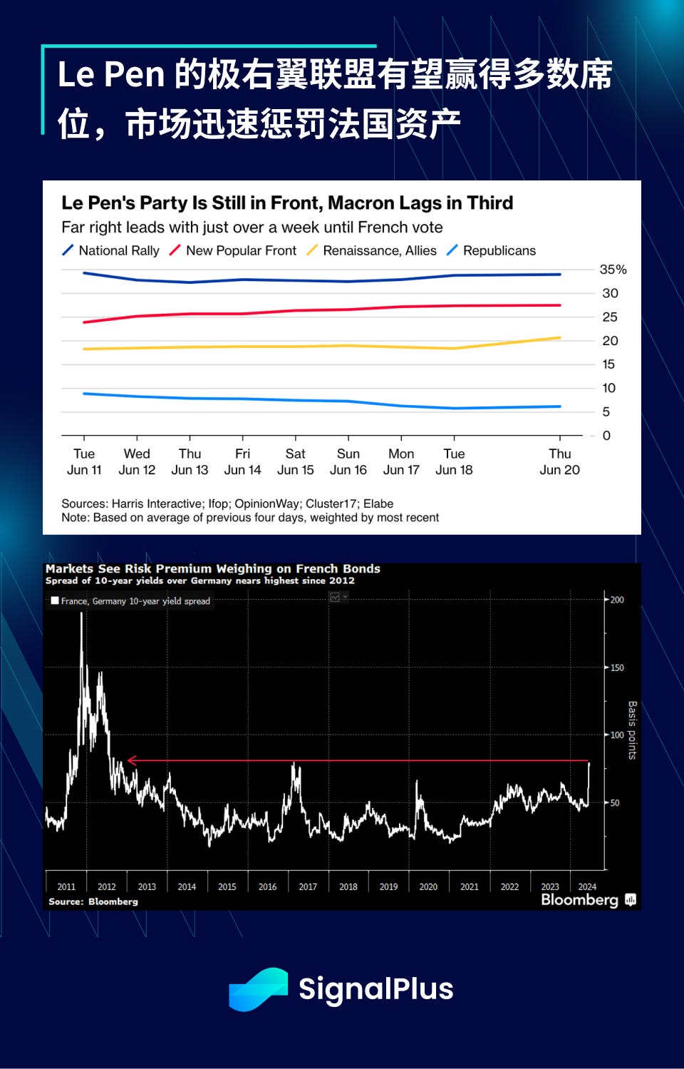 法国选举将于 6 月 29/30 日开始,第二轮将于 7 月 6/7 日举行。Le Pen 的 National Rally 仍稳居领先地位,极右翼联盟有望获得绝对多数,市场已经先对法国资产投下不信任票,法国国债相对德国国债的利差扩大至 2012 年以来的最高水平。