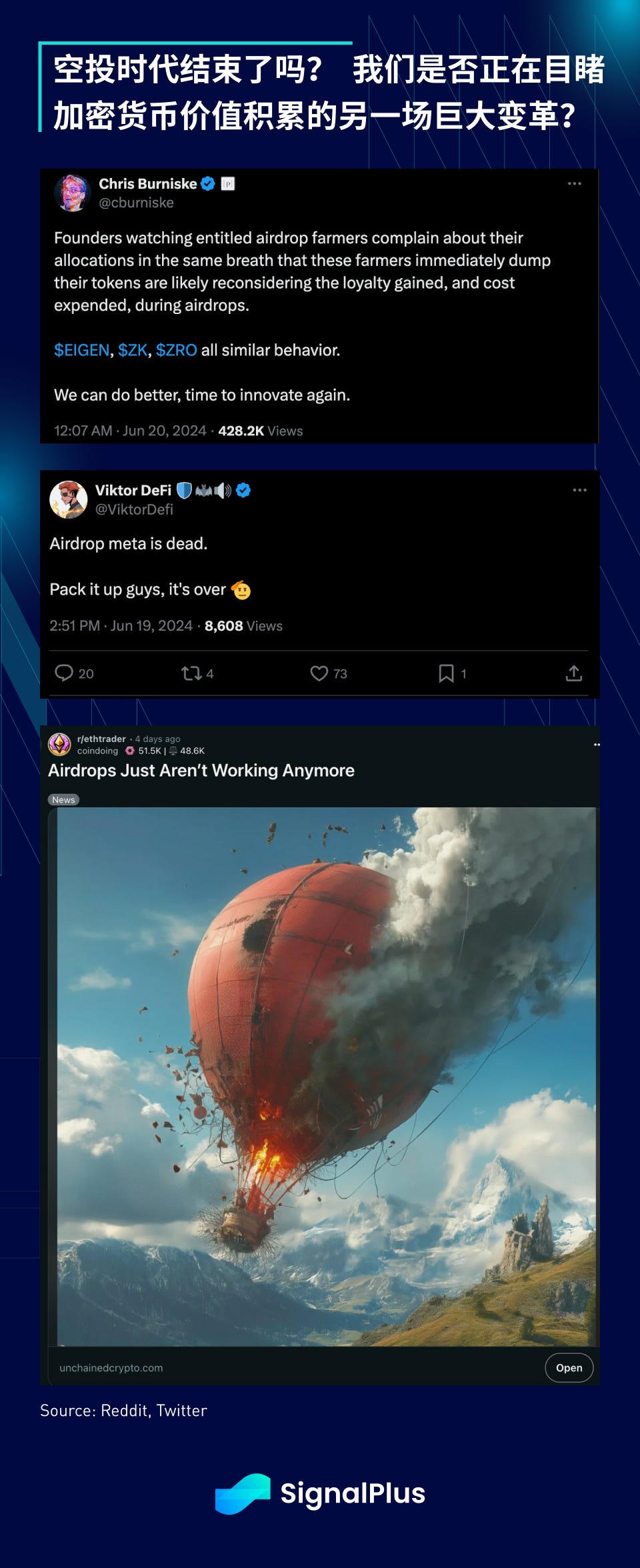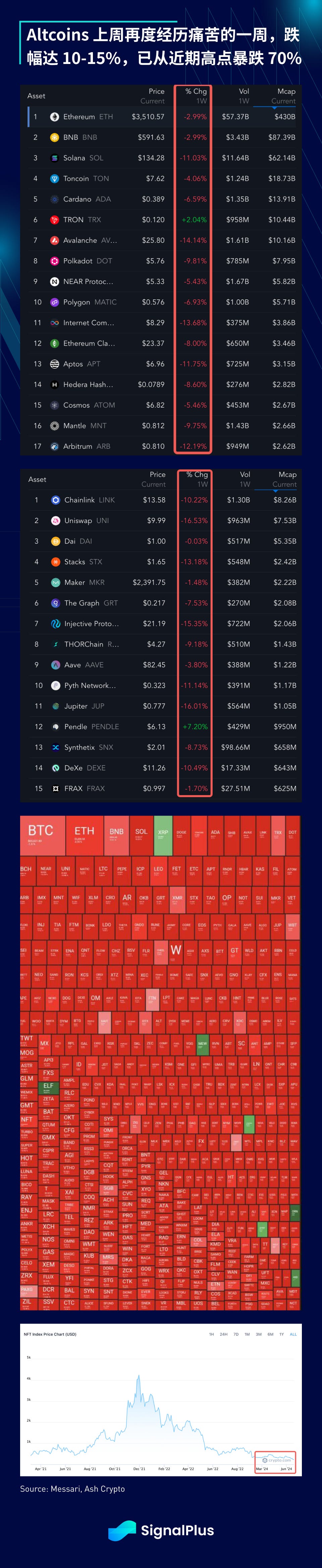 本周期的一个不同之处,就是主要币种的反弹不太可能导致 altcoins/NFT 的正面溢出效应,但上周加密货币原生用户受到了尤其严重的打击,原因是知名 DeFi 项目发生各种空投“阴谋”,许多原生用户在过去一年里一直努力耕耘空投,作为新的“alpha”,但 zkSync、Layer Zero、Eigenlayer 等项目的实际奖励明显低于预期,动摇了用户的信心,甚至引发了许多关于空投“时代”已经结束的讨论。随着 NFT、memecoin 和以太坊 L1 手续费不断下跌,原生生态系统是否会迎来另一场巨大变革?确实是相当有趣的一年。