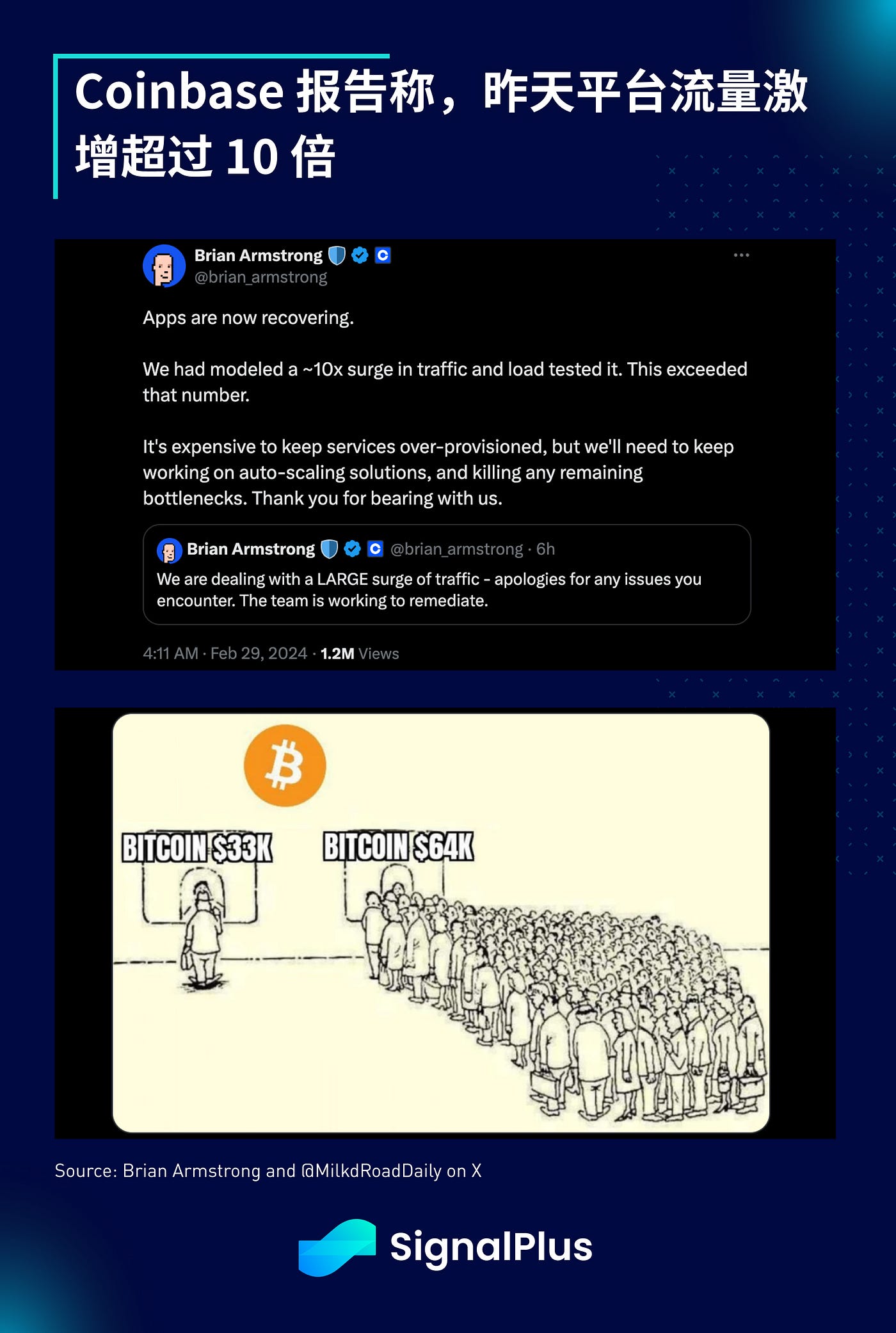 美國的散戶交易活動非常活躍,以至於 Coinbase 網站一度出現事故,客戶餘額顯示為 0 ,並導致價格在幾分鐘內從 6.4 萬左右突然暴跌 5% + 至約 5.9 萬美元。 Coinbase CEO Brian Armstrong 在 X 上承認了這次平台事故,並重申投資者餘額是安全的,他們還沒準備好應對流量突然增加 10 倍以上,導致大範圍的交易中斷。