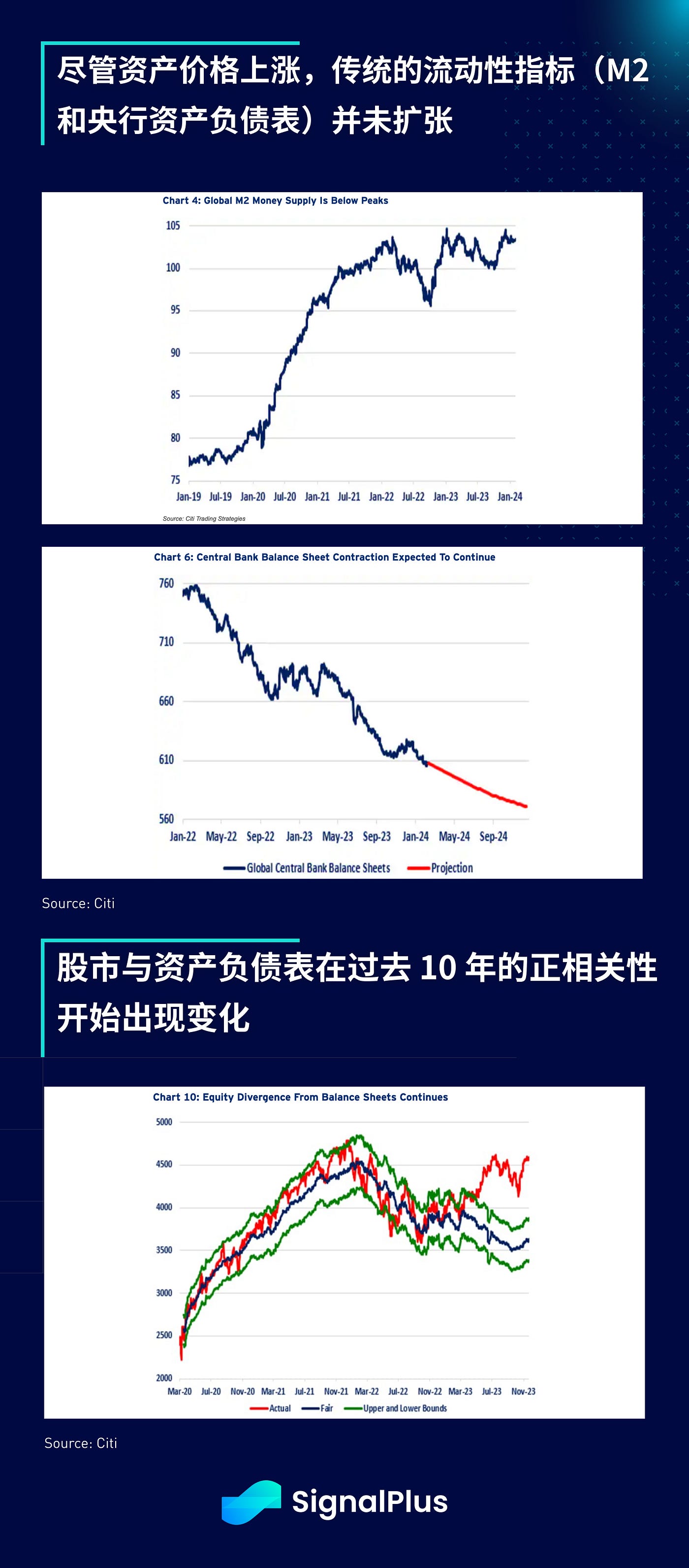 在市場瀰漫著風險偏好情緒之際,花旗提出了一個有趣的問題:「錢」是從哪裡來的? 傳統的M 2 流動性指標仍保持在2023 年的水平,而全球量化緊縮(QT) 持續不減,央行資產負債表預計到年底將從7, 600 億美元的峰值縮減至約5, 600 億美元 ,因此,與過去十年的零利率政策/量化寬鬆時代不同,當前資產價格的上漲並不是由寬鬆的央行貨幣政策所推動的。
