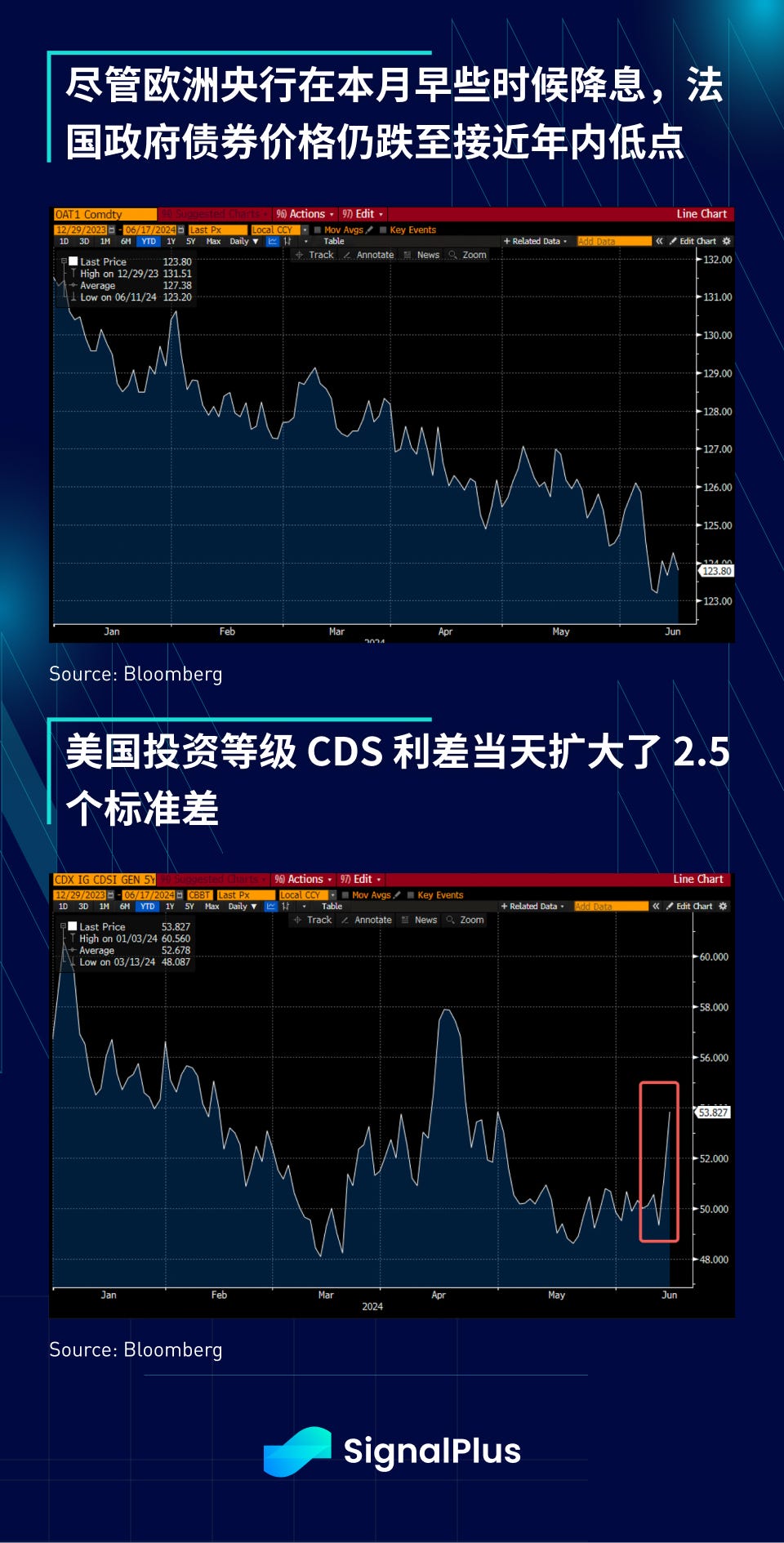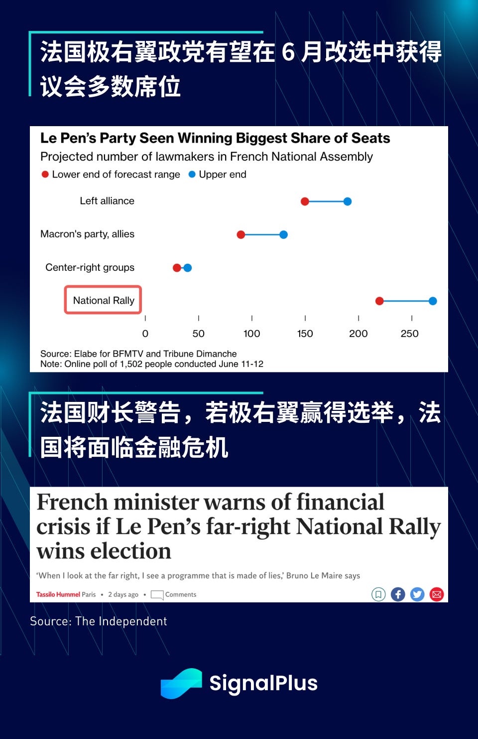全球政治再次成為焦點,在其盟友在上週歐洲議會選舉中慘敗後,法國總統 Macron 意外宣布解散國會、重新選舉。由Le Pen 領導的RN/National Rally 在民調中取得顯著進展,似乎表明極右翼政黨在6 月30 日的選舉中有望獲得絕對多數,這使得“法國脫歐”的風險增加,現任財長也對可能引發的金融危機發出警告。