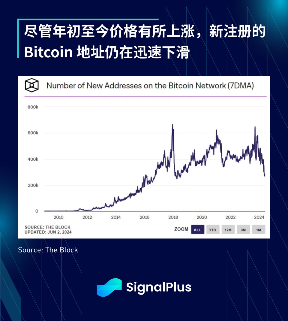 上週加密貨幣市場情緒仍然低迷,缺乏催化劑,價格表現疲軟,過去兩週出現了一連串期貨多頭被緩慢清算的情況。與全球股票、大宗商品甚至黃金的普遍上漲相比,加密貨幣的季度表現也很疲弱,下跌5% ,年初至今新註冊的Bitcoin 地址也出現下滑,這與我們長期的論點一致,當前的反彈與先前的週期不同,主要是由TradFi 對少數代幣(或實際上只有BTC)的興趣所推動的,同時,隨著一般投資者的興趣轉向下一個熱點(AI),加密貨幣本身的影響力正在縮小,行業裡剩下的建設者主要專注於提高區塊鏈和資本市場效率,相比於加密貨幣習慣的“一夜致富”主題,這些項目具有崇高的目標,但通常需要更長的時間,誰說加密貨幣不能更成熟呢?