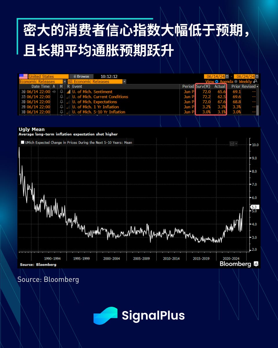 上週五的經濟數據也沒有任何幫助,密大的消費者信心指數落在 65.6 ,大幅低於預期的 72 ,為 11 月以來的最低水準。此外,通膨預期也朝著錯誤方向發展,關鍵的 5–10 年通膨預期中位數卡在了 3.3% ,長期平均預期則飆升至 5.3% ,創下 1994 年以來的最高水準。
