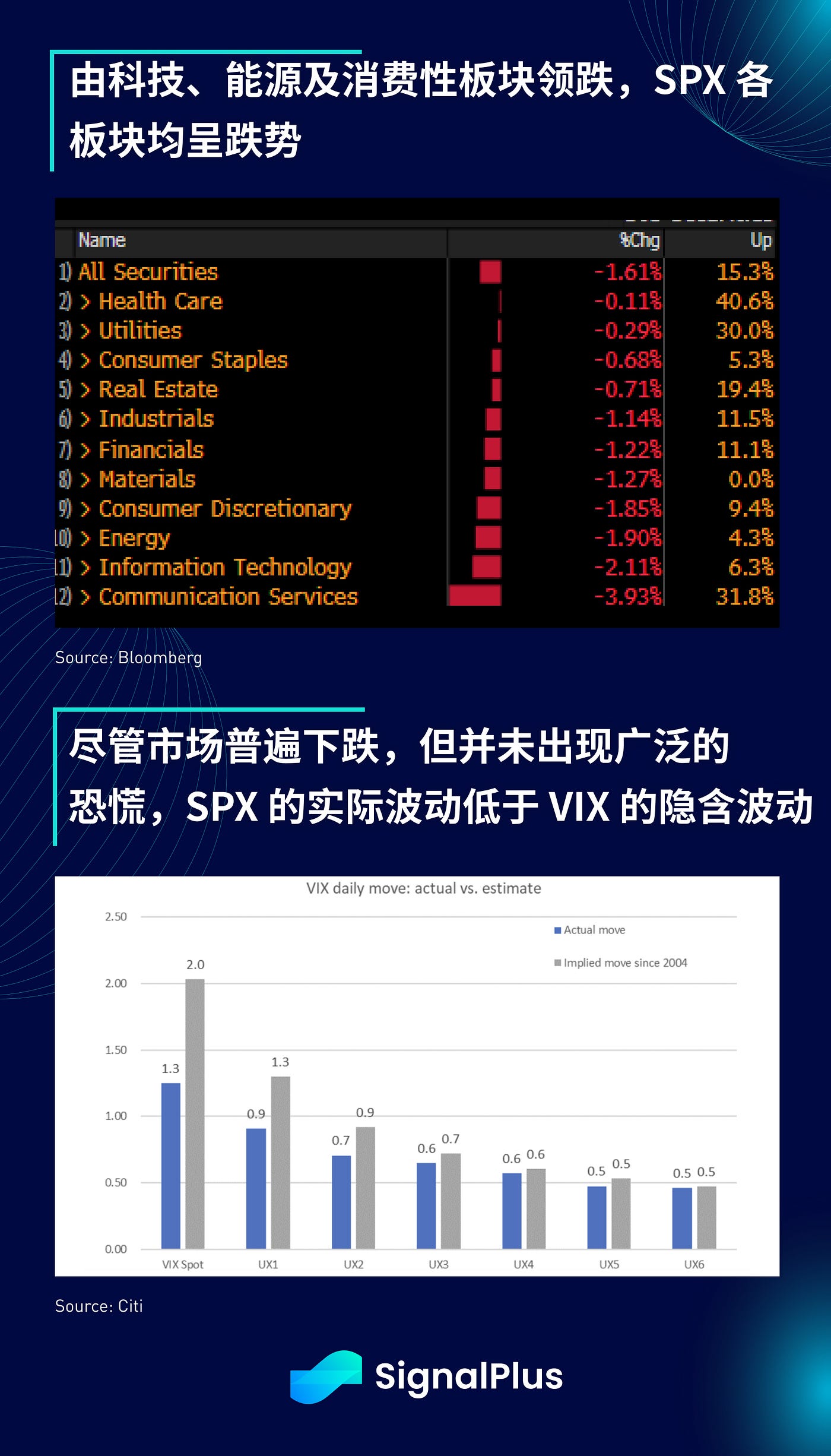在股市方面,除了鷹派聯準會和 NYCB 引發的恐慌之外,各大企業財報普遍令人失望。 AMD (-2.6% )、Samsung (-2% )、Google (-7% )、Microsoft (-2.5% ) 和 Disney (-2.5% ) 獲利均未達到目前高期望值。 科技、能源和非必需消費品板塊領跌指數,但並沒有出現廣泛的恐慌,SPX 的實際波動基本上低於 VIX 的隱含波動。