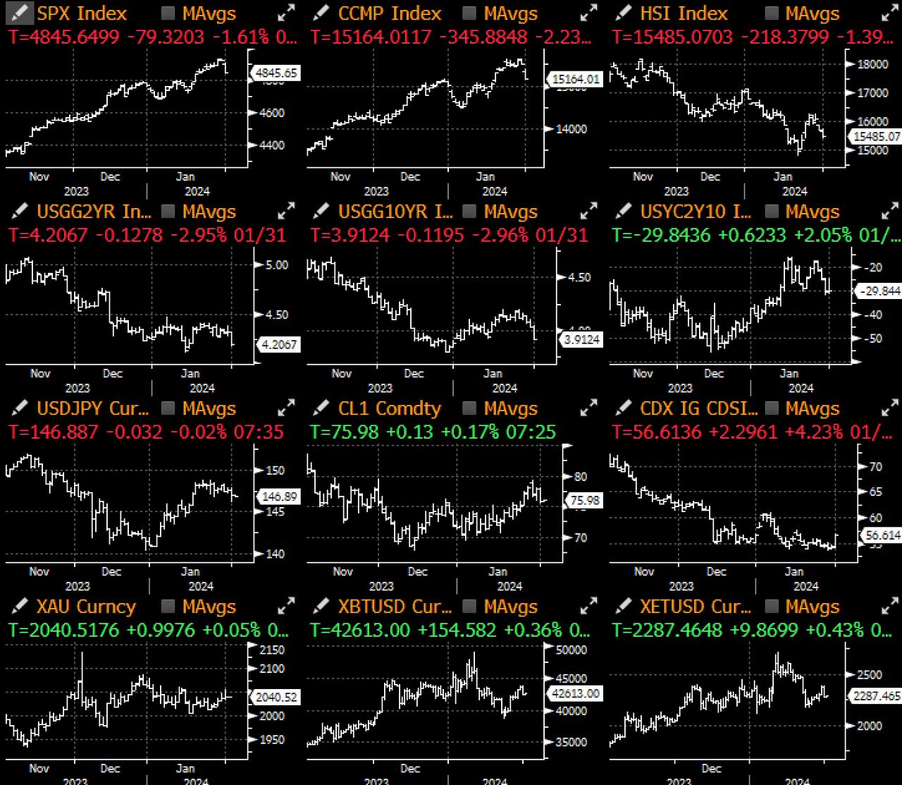 [Powell]“认为美联储不太可能在三月降息”。最后的评论起到了致命一击的作用, 2 年期美债收益率上升约 8 个基点,股市当天暴跌约 1.5% ,看来真正的 2024 年才刚开始。