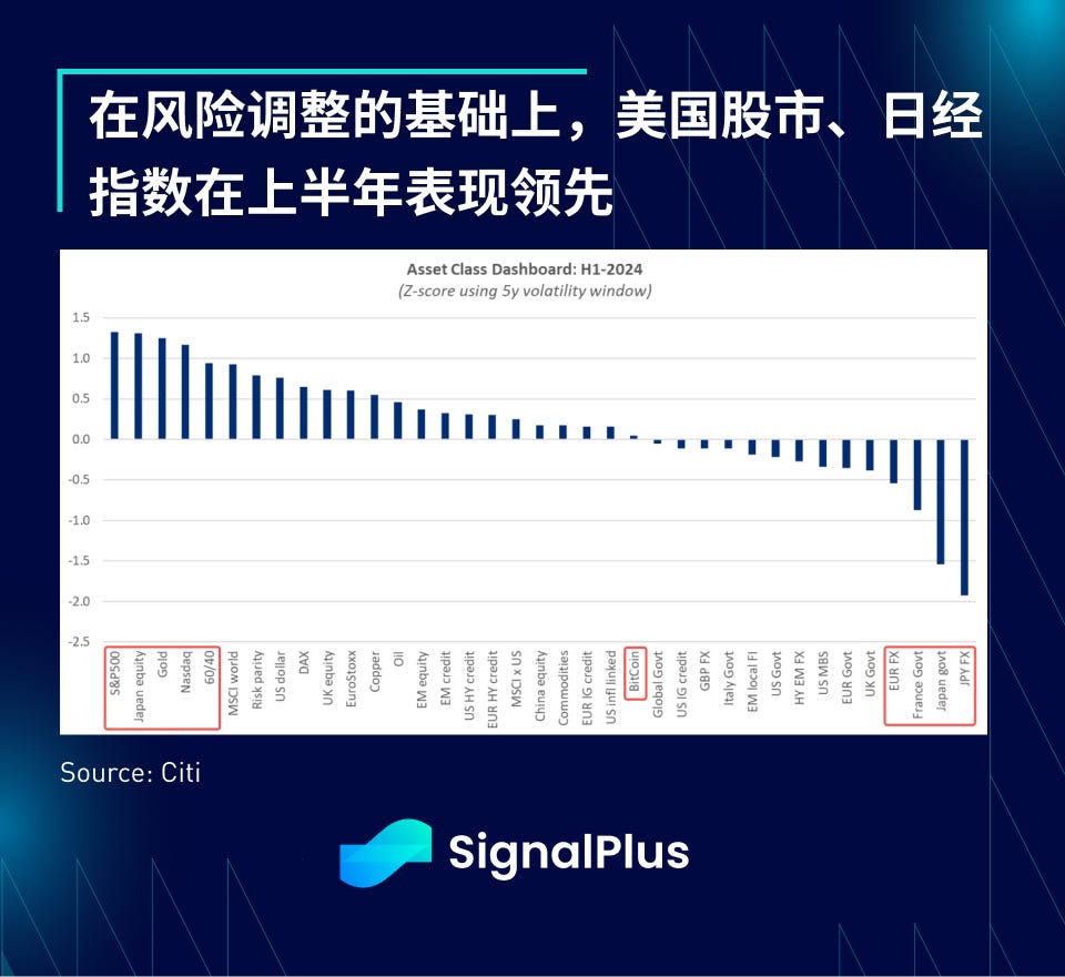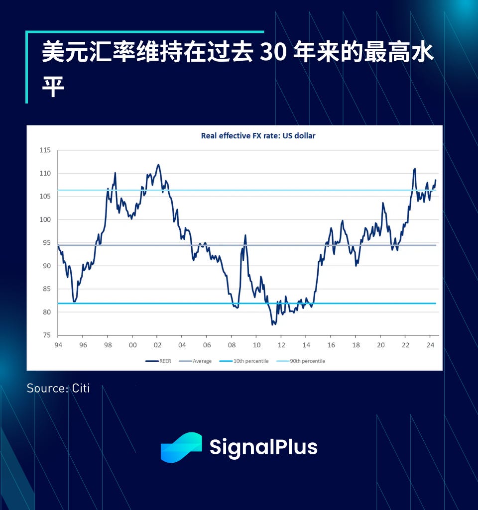 在下半年,美国大选将成为焦点,市场表现可能仍会超出预期,尽管可能与上半年的风格不同。我们长期认为这次选举的主轴是关于不可持续的美国财政政策,并通过债券市场表现出来,带来更高的收益率和更陡的收益率曲线,不过总体而言,美国客户认为关税政策更重要,认为美元走强是更好的选择,虽然我们基本认同这个观点,但不确定还有多少上行空间,毕竟美元指数目前仅比过去 30 年的峰值低几个百分点而已。